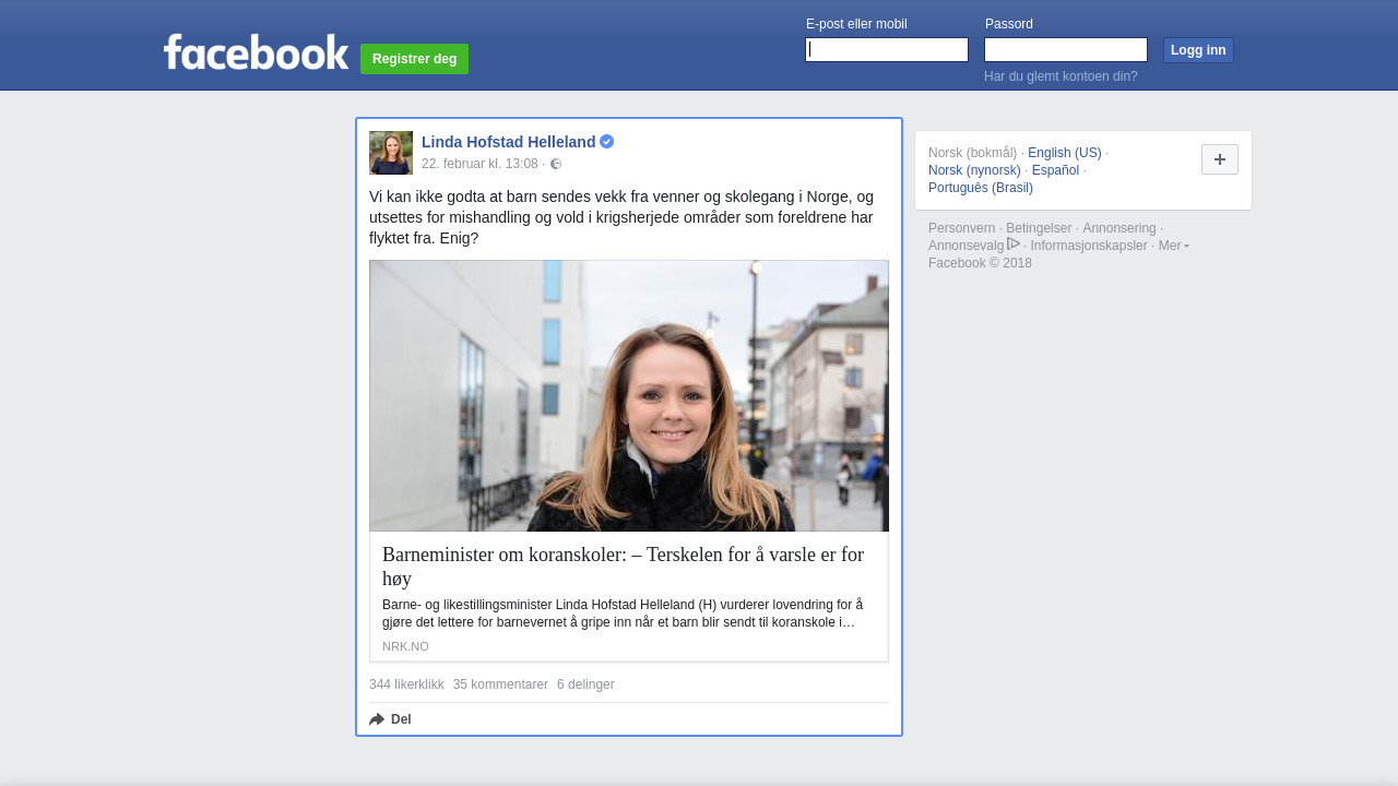 Barne- og likestillingsminister Linda Hofstad Helleland (H) vurderer lovendring for å gjøre det lettere for barnevernet å gripe inn når et barn blir sendt til koranskole i utlandet mot sin vilje.