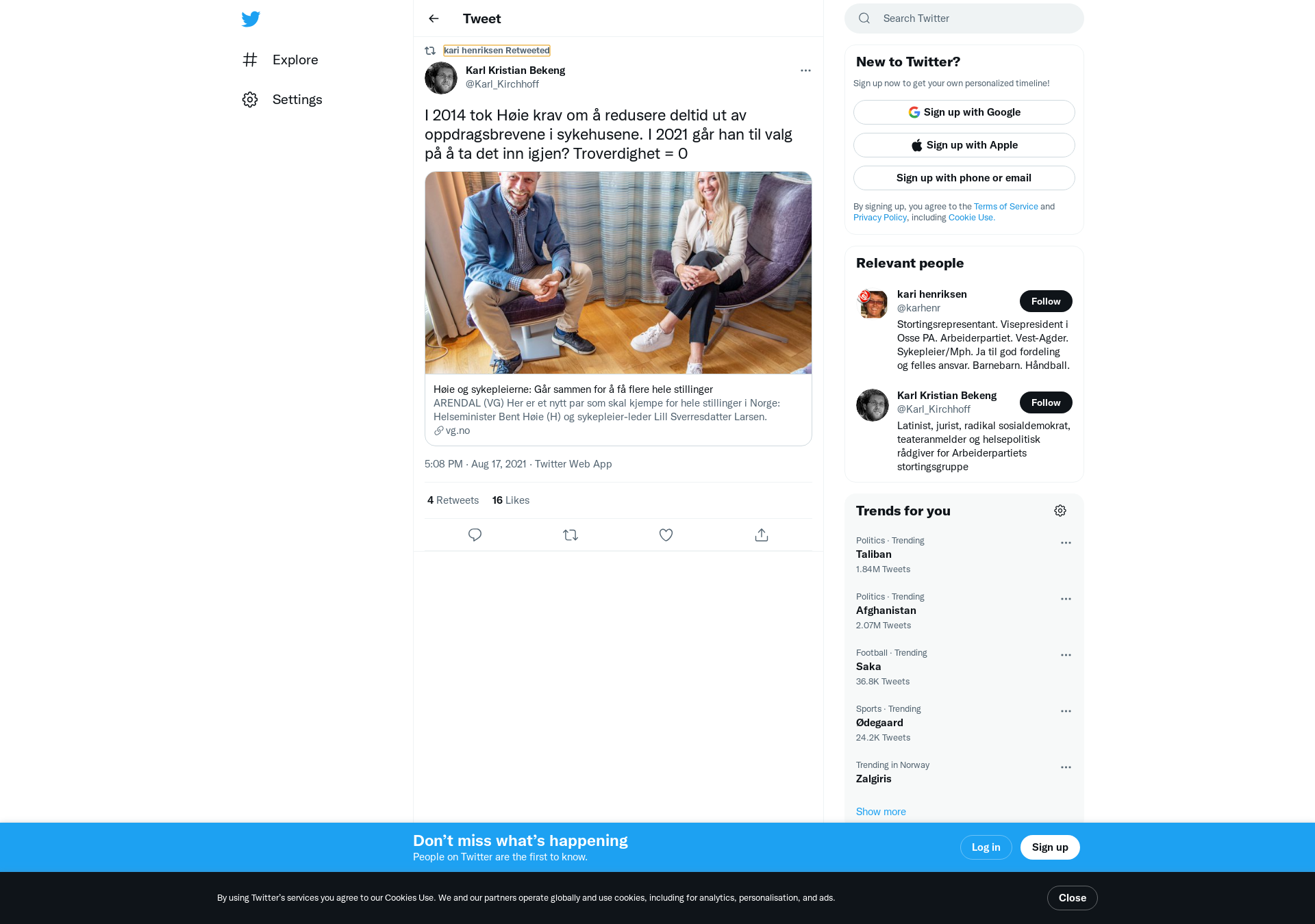 RT @Karl_Kirchhoff: I 2014 tok Høie krav om å redusere deltid ut av oppdragsbrevene i sykehusene. I 2021 går han til valg på å ta det inn igjen? Troverdighet = 0 https://t.co/cO00ddKp6Z