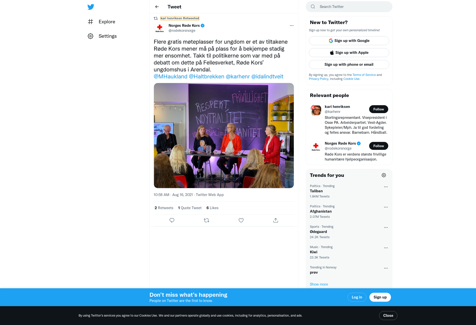 RT @rodekorsnorge: Flere gratis møteplasser for ungdom er et av tiltakene Røde Kors mener må på plass for å bekjempe stadig mer ensomhet. Takk til politikerne som var med på debatt om dette på Fellesverket, Røde Kors’ ungdomshus i Arendal.