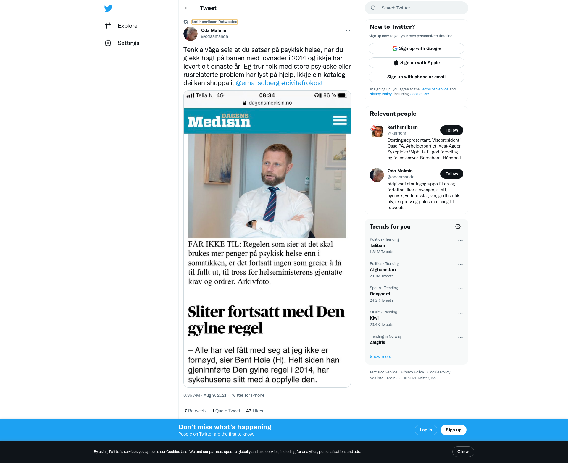 RT @odaamanda: Tenk å våga seia at du satsar på psykisk helse, når du gjekk høgt på banen med lovnader i 2014 og ikkje har levert eit einaste år. Eg trur folk med store psykiske eller rusrelaterte problem har lyst på hjelp, ikkje ein katalog dei kan shoppa i, @erna_solberg #civitafrokost https://t.co/dz778BnLyM