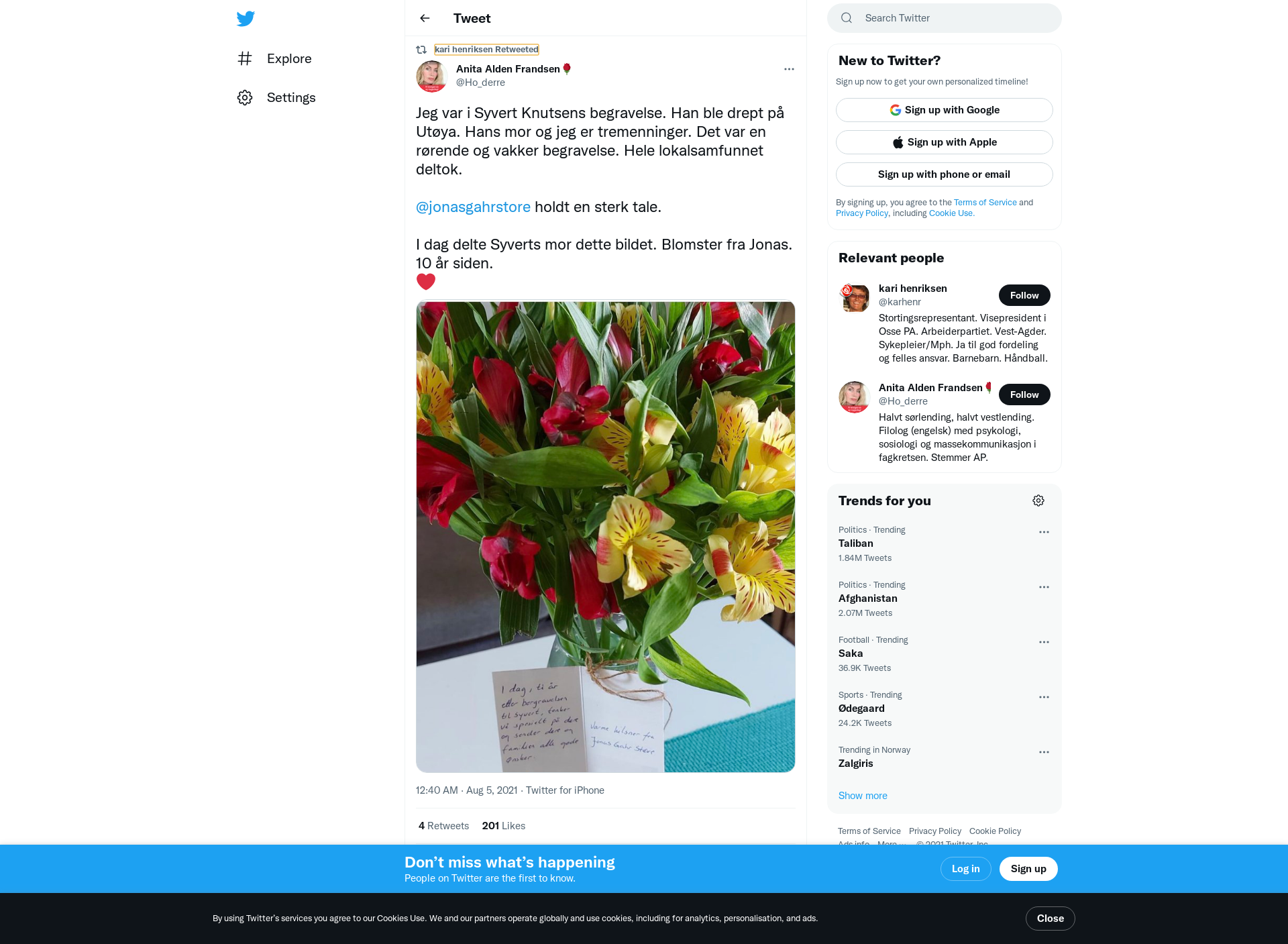 RT @Ho_derre: Jeg var i Syvert Knutsens begravelse. Han ble drept på Utøya. Hans mor og jeg er tremenninger. Det var en rørende og vakker begravelse. Hele lokalsamfunnet deltok.