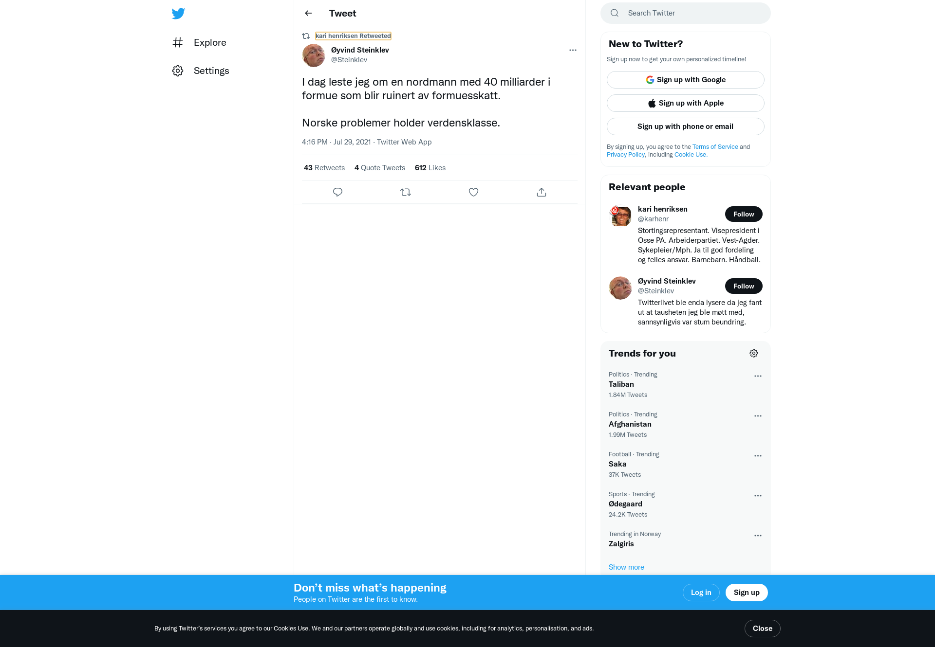 RT @Steinklev: I dag leste jeg om en nordmann med 40 milliarder i formue som blir ruinert av formuesskatt. Norske problemer holder verdens…
