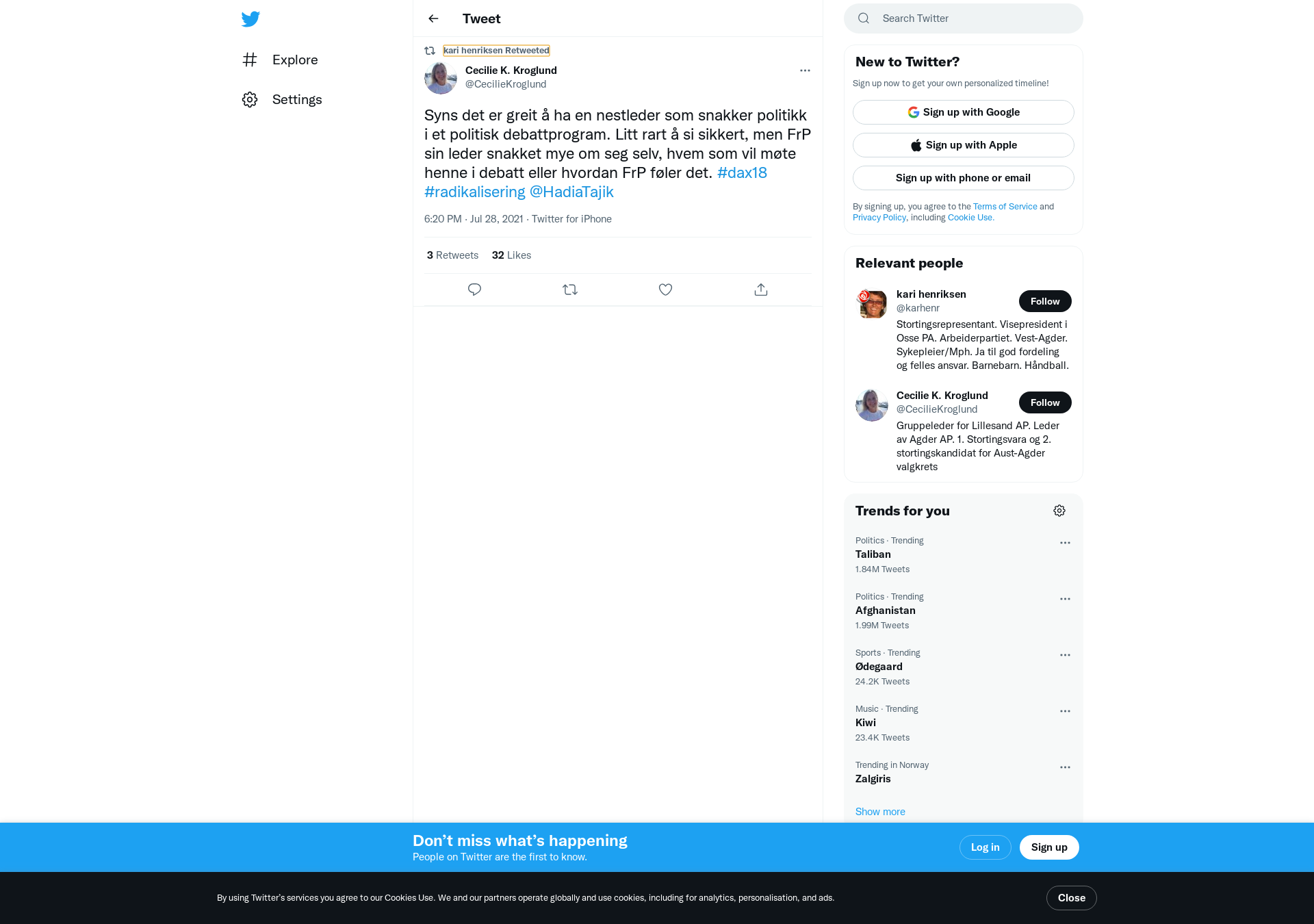 RT @CecilieKroglund: Syns det er greit å ha en nestleder som snakker politikk i et politisk debattprogram. Litt rart å si sikkert, men FrP sin leder snakket mye om seg selv, hvem som vil møte henne i debatt eller hvordan FrP føler det. #dax18 #radikalisering @HadiaTajik