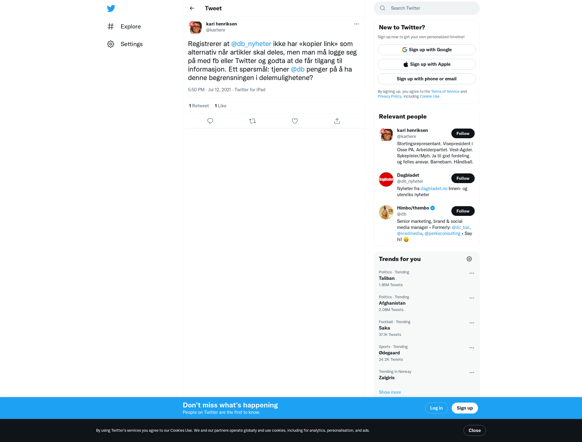 Registrerer at @db_nyheter ikke har «kopier link» som alternativ når artikler skal deles, men man må logge seg på med fb eller Twitter og godta at de får tilgang til informasjon. Ett spørsmål: tjener @db penger på å ha denne begrensningen i delemulighetene?