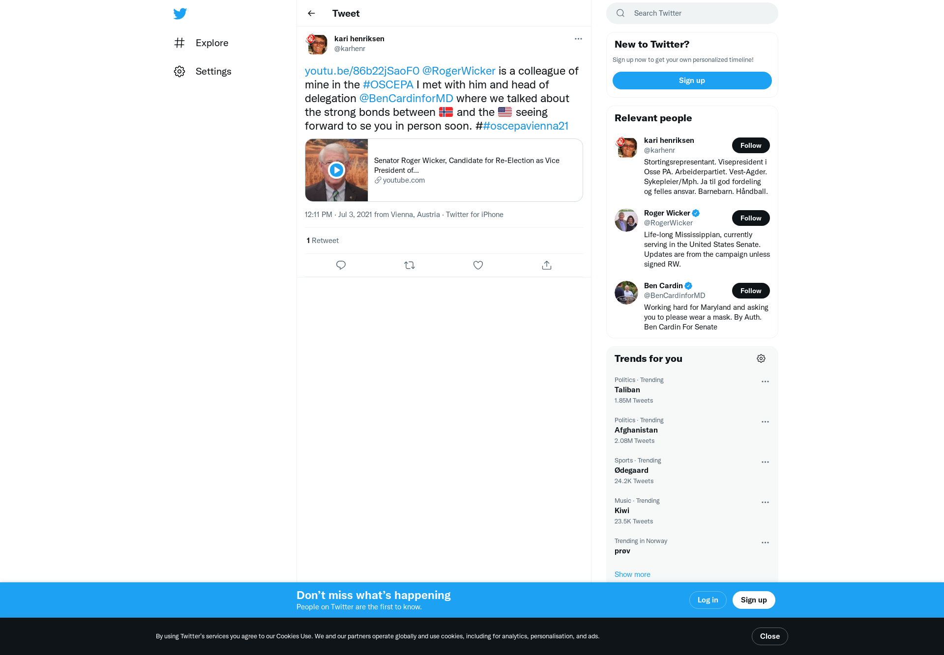 https://t.co/teTf64BEHq @RogerWicker is a colleague of mine in the #OSCEPA I met with him and head of delegation @BenCardinforMD where we talked about the strong bonds between 🇳🇴 and the 🇺🇸 seeing forward to se you in person soon. ##oscepavienna21