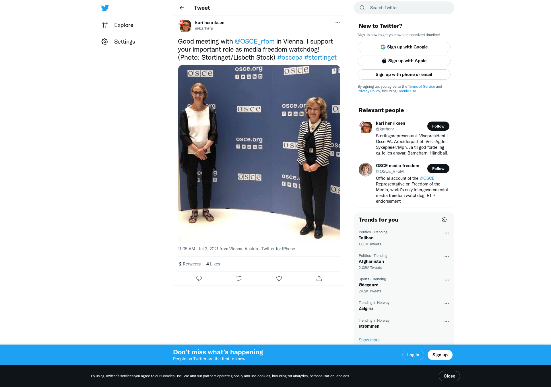 Good meeting with @OSCE_rfom in Vienna. I support your important role as media freedom watchdog! (Photo: Stortinget/Lisbeth Stock) #oscepa #stortinget https://t.co/QaHECpp1BH