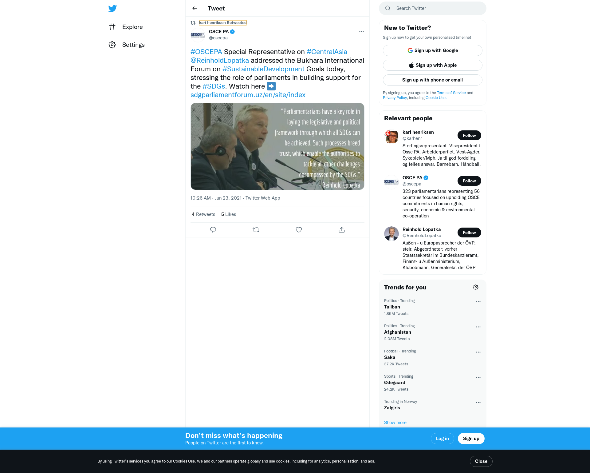 RT @oscepa: #OSCEPA Special Representative on #CentralAsia @ReinholdLopatka addressed the Bukhara International Forum on #SustainableDevelopment Goals today, stressing the role of parliaments in building support for the #SDGs. Watch here ➡️ https://t.co/ZjnN1iHO1Z https://t.co/pMTUScqLhB
