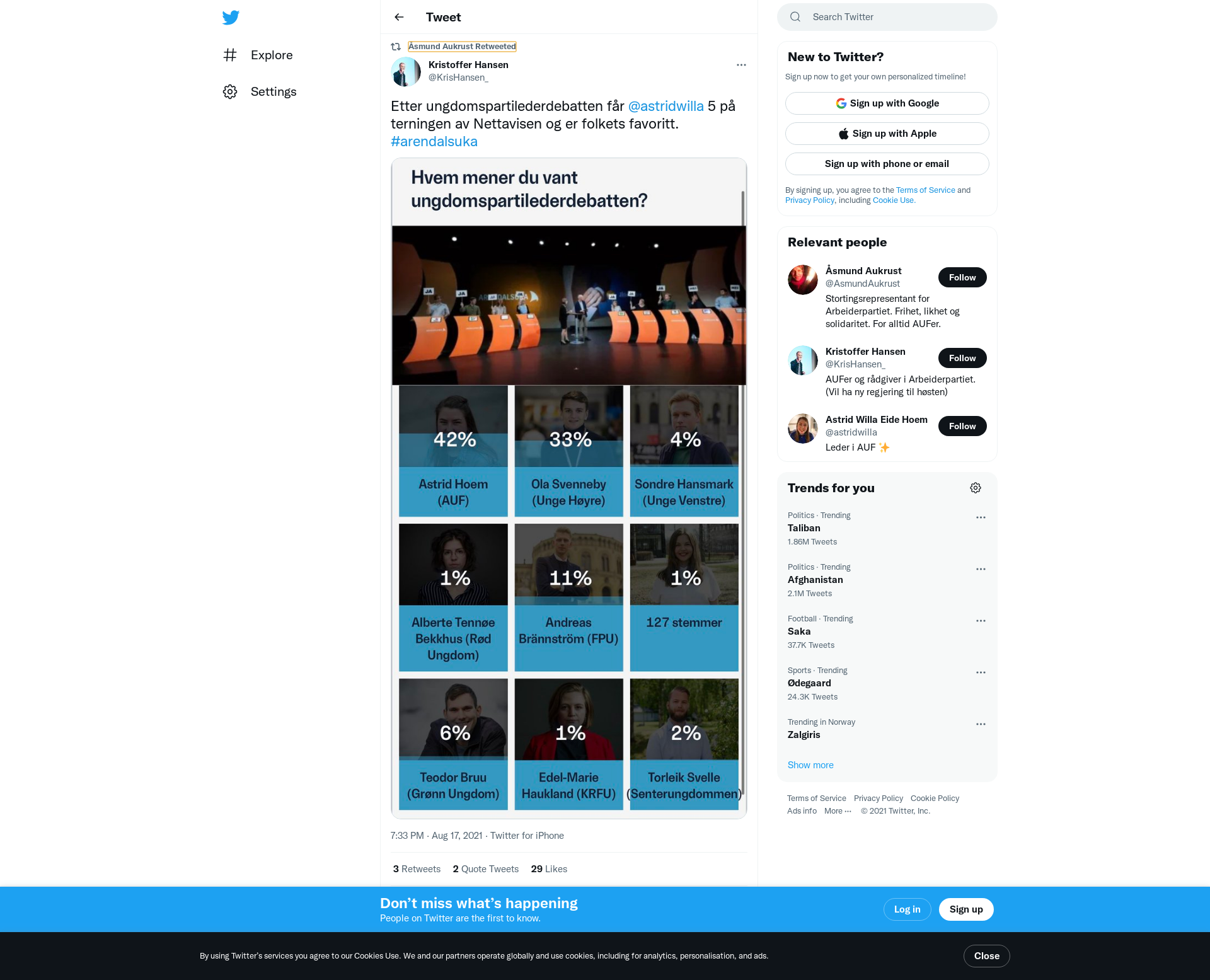 RT @KrisHansen_: Etter ungdomspartilederdebatten får @astridwilla 5 på terningen av Nettavisen og er folkets favoritt. #arendalsuka https://t.co/IeV5B0sKls