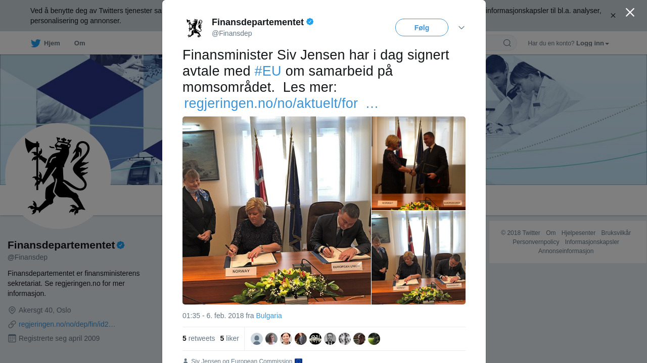 Finansminister Siv Jensen undertegnet i dag en avtale med EU for å sikre tettere samarbeid mellom Norge og EU i kampen mot merverdiavgiftssvindel. Bulgarias finansminister Vladislav Goranov undertegnet på vegne av Rådet for Den europeiske union. Avtale...