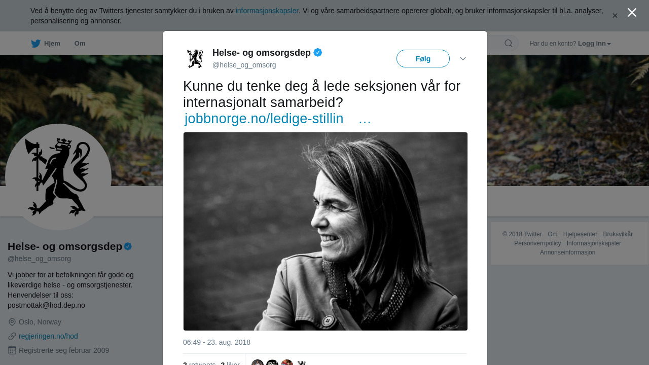 Stillingstittel: Avdelingsdirektør i seksjon for internasjonalt samarbeid i administrasjonsavdelinga (156618), Arbeidsgiver: Helse- og omsorgsdepartementet, Søknadsfrist: 13. september 2018