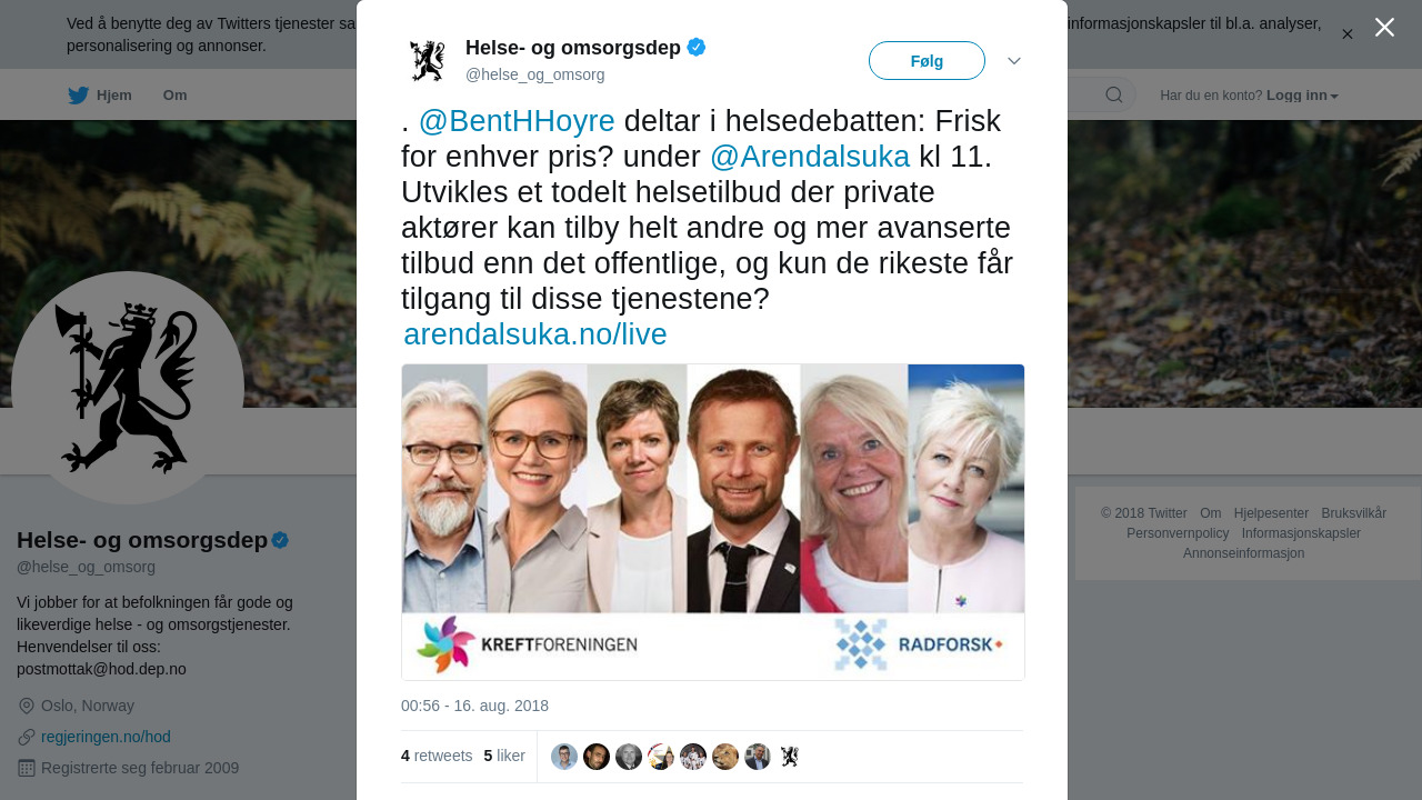 . @BentHHoyre deltar i helsedebatten: Frisk for enhver pris? under @Arendalsuka kl 11. Utvikles et todelt helsetilb… https://t.co/UbiDLF9PBk