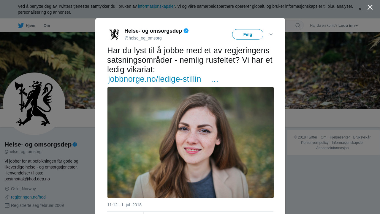 Stillingstittel: Vikariat som rådgjevar/seniorrådgjevar i seksjon for tverrfaglege tenester og tannhelsetenester (154862), Arbeidsgiver: Helse- og omsorgsdepartementet, Søknadsfrist: 10. juli 2018
