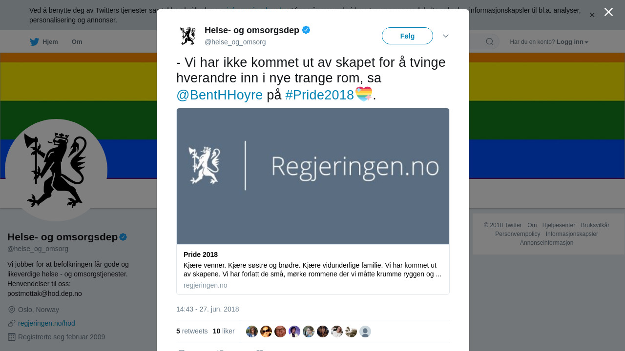 - Vi har ikke kommet ut av skapet for å tvinge hverandre inn i nye trange rom, sa @BentHHoyre på #Pride2018. https://t.co/O5weF7o1io