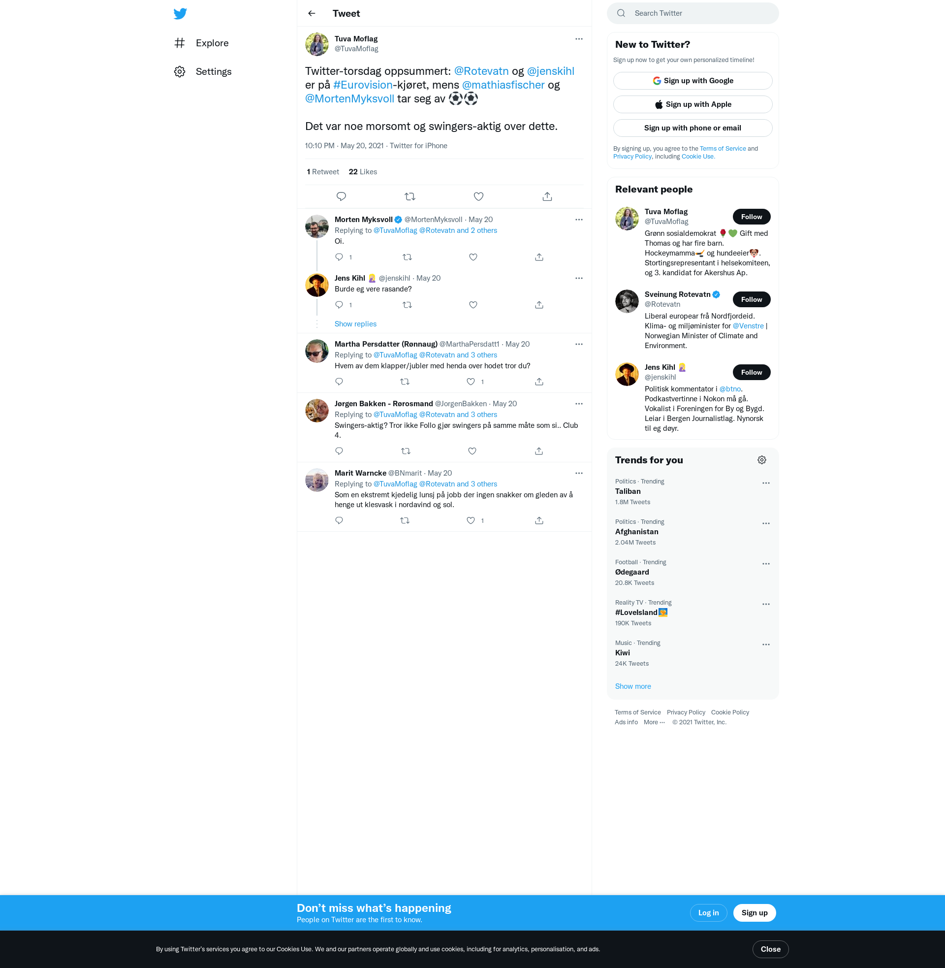Twitter-torsdag oppsummert: @Rotevatn og @jenskihl er på #Eurovision-kjøret, mens @mathiasfischer og @MortenMyksvoll tar seg av ⚽️⚽️ Det var noe morsomt og swingers-aktig over dette.