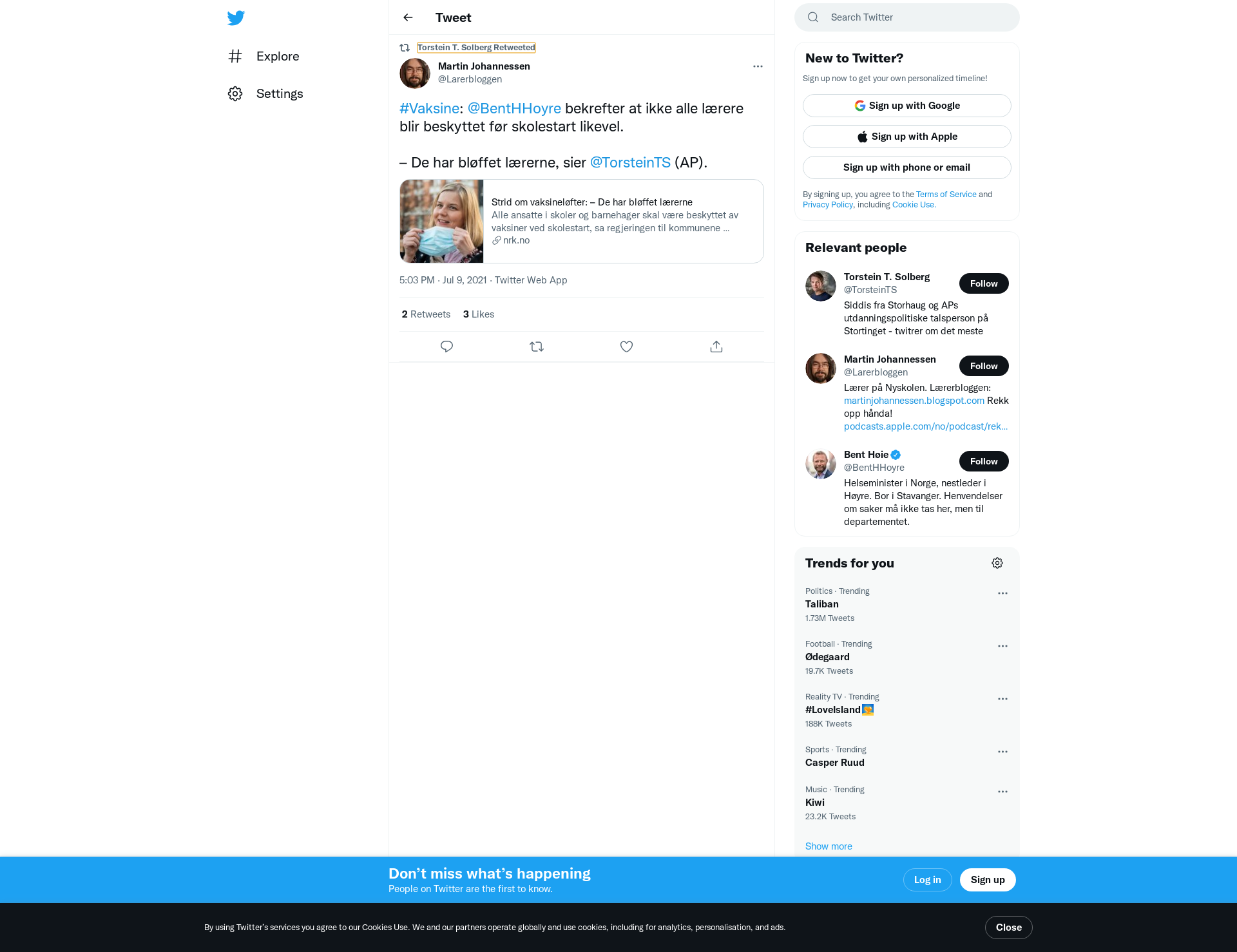 RT @Larerbloggen: #Vaksine: @BentHHoyre bekrefter at ikke alle lærere blir beskyttet før skolestart likevel. – De har bløffet lærerne, sie…