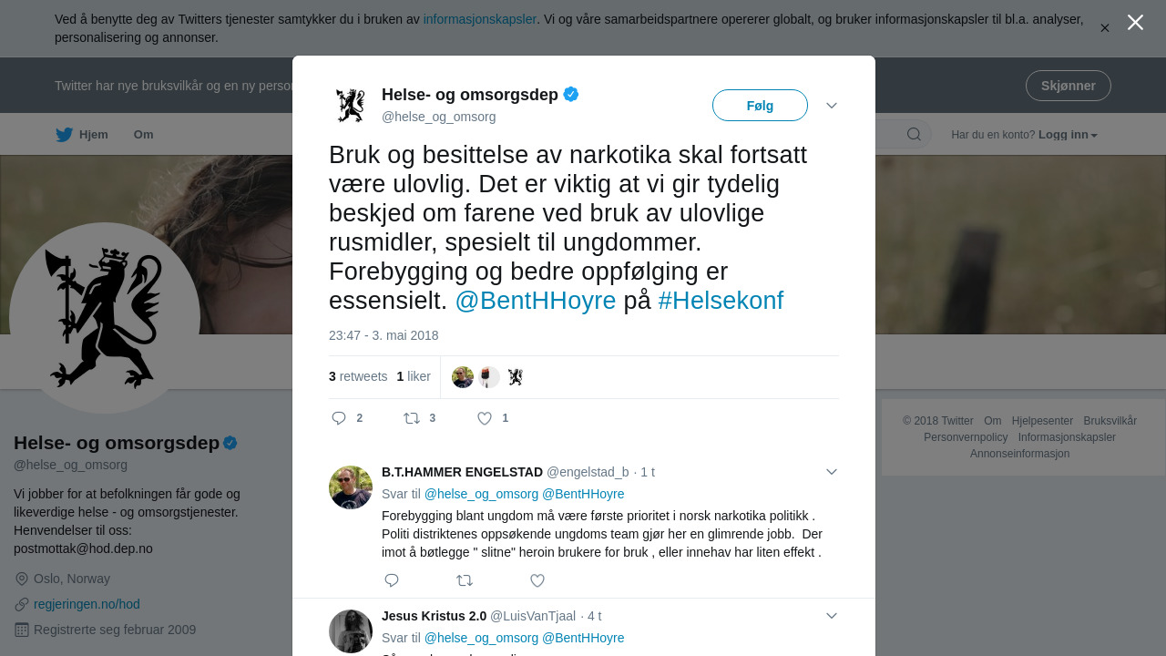 Bruk og besittelse av narkotika skal fortsatt være ulovlig. Det er viktig at vi gir tydelig beskjed om farene ved bruk av ulovlige rusmidler, spesielt til ungdommer. Forebygging og bedre oppfølging er essensielt. @BentHHoyre på #Helsekonf