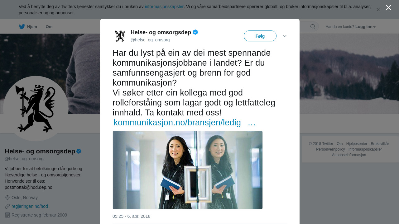 Helse- og omsorgsdepartementet (HOD) har det overordna ansvaret for at folk får gode og likeverdige helse- og omsorgstenester. Departementet har ansvar for eldre- og folkehelsepolitikken og for primærhelse- og spesialisthelsetenesta, inkludert e-helse, helserett og eigarskapsforvalting av helseføretaka. Departementet har 210 tilsette.