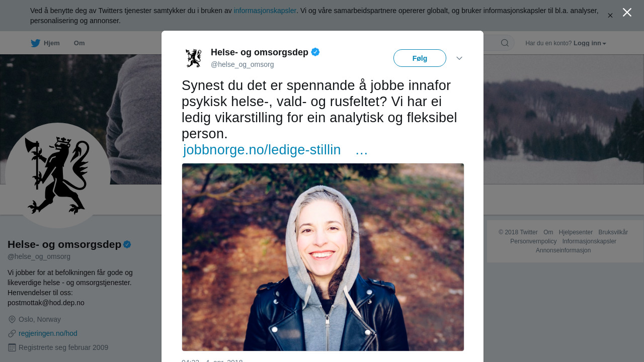 Stillingstittel: Førstekonsulent/rådgjevar (vikariat i 12 månader) i Primærhelsetenesteavdelinga (150645), Arbeidsgiver: Helse- og omsorgsdepartementet, Søknadsfrist: 17. april 2018