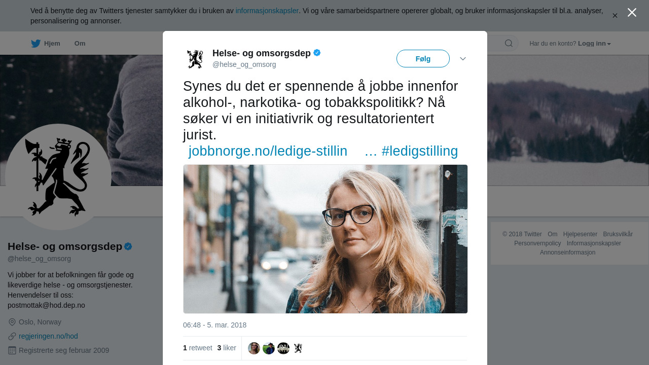 Stillingstittel: Jurist, rådgjevar/seniorrådgjevar i folkehelseavdelinga - engasjement i 12 mnd. med høve til lenging (149091), Arbeidsgiver: Helse- og omsorgsdepartementet, Søknadsfrist: 18. mars 2018