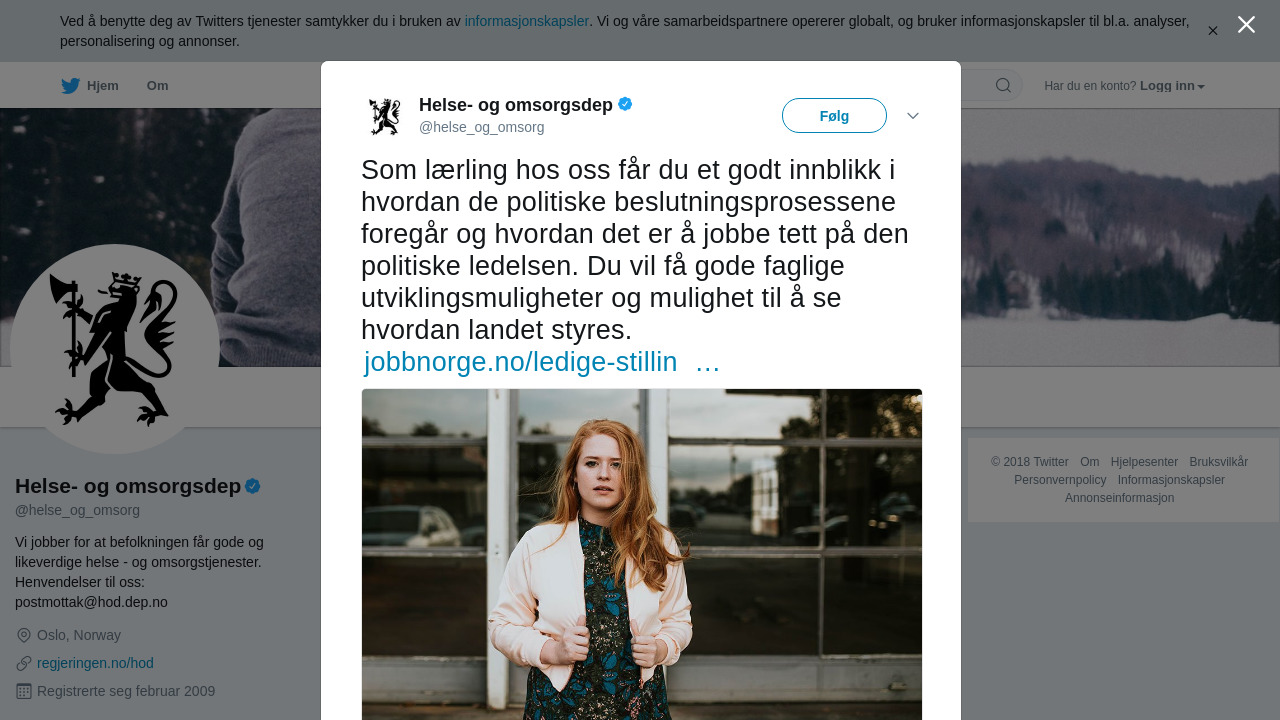 Stillingstittel: Lærling i Helse- og omsorgsdepartementet (147516), Arbeidsgiver: Helse- og omsorgsdepartementet, Søknadsfrist: 19. februar 2018