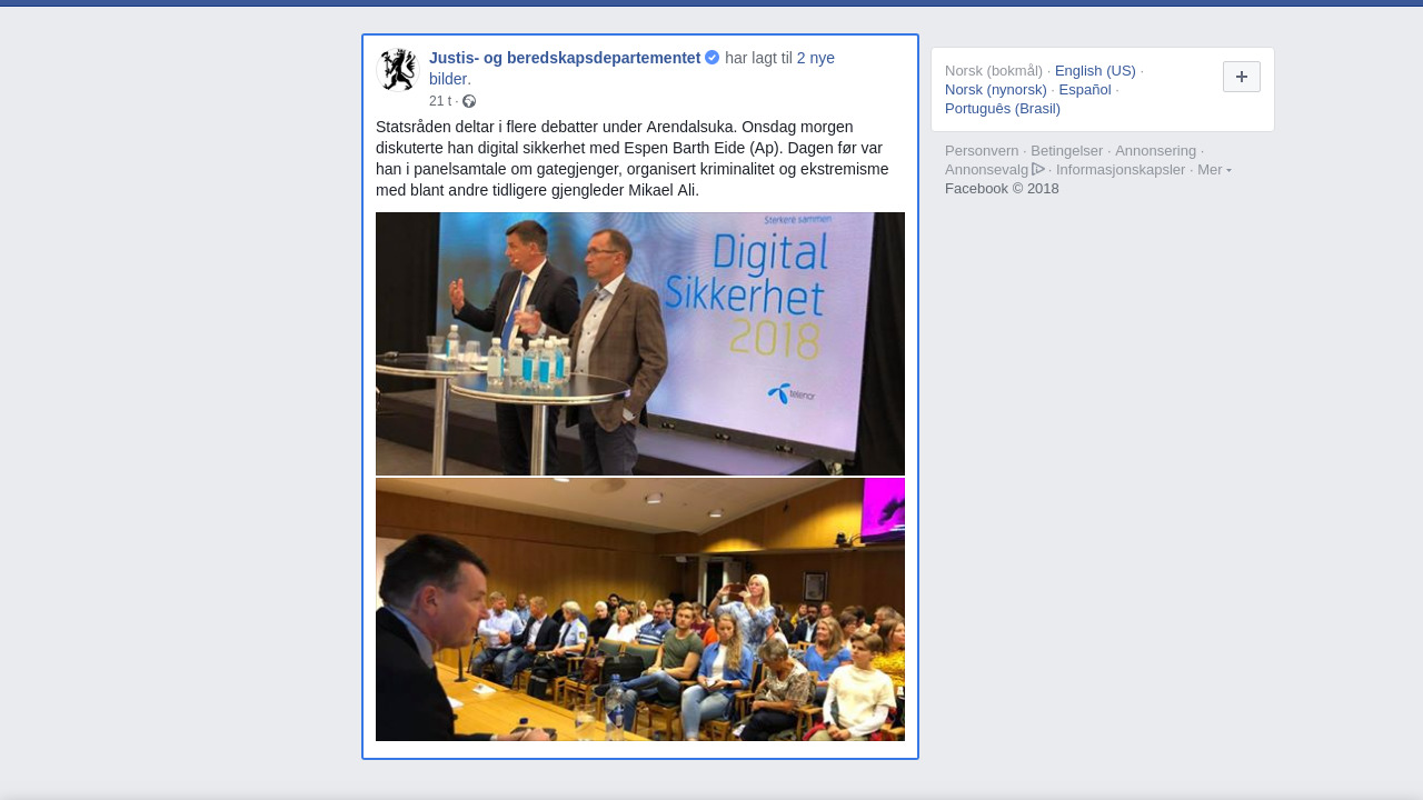 Statsråden deltar i flere debatter under Arendalsuka. Onsdag morgen diskuterte han digital sikkerhet med Espen Barth Eide (Ap). Dagen før var han i panelsamtale om gategjenger, organisert kriminalitet og ekstremisme med blant andre tidligere gjengleder Mikael Ali.