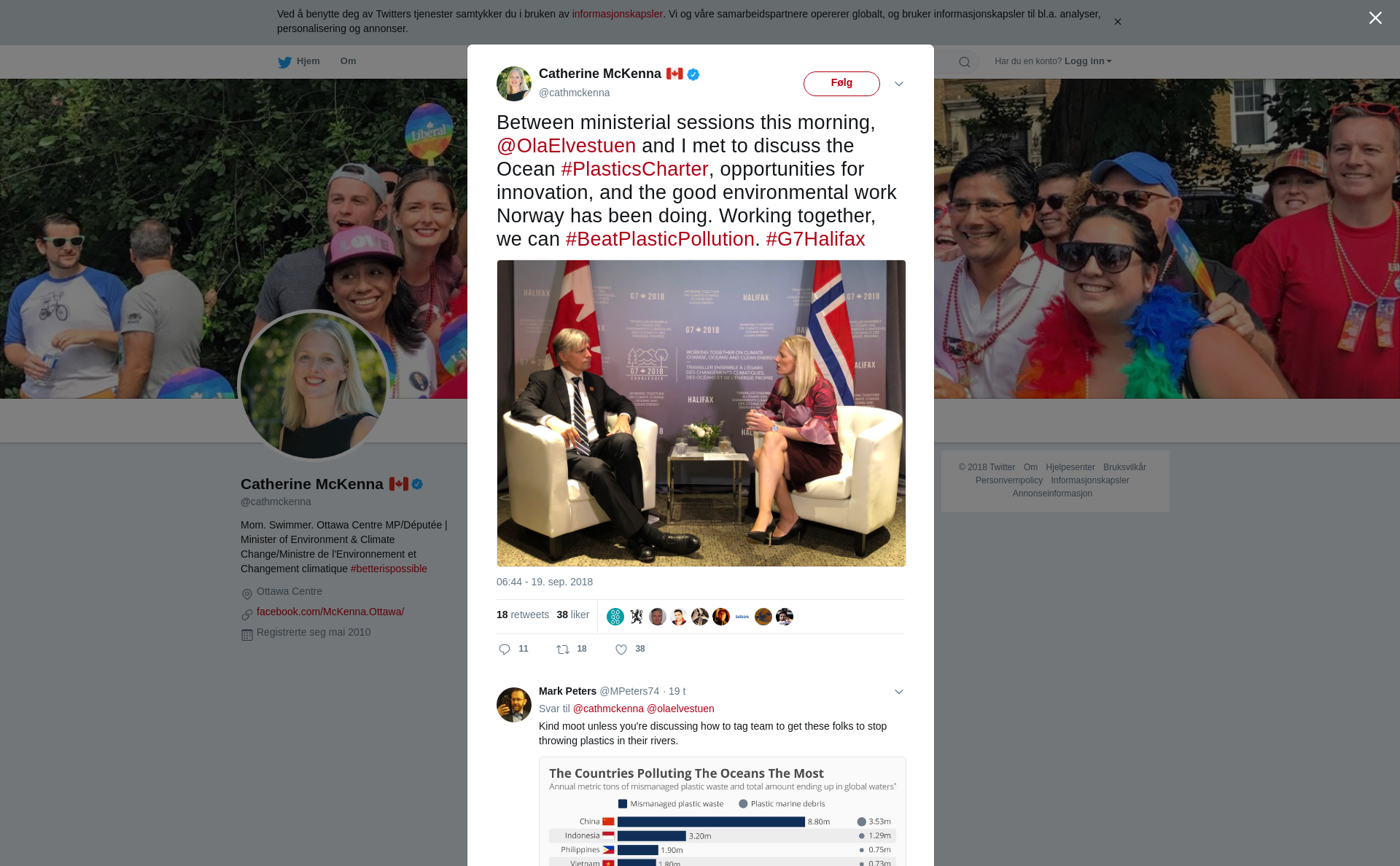 RT @cathmckenna: Between ministerial sessions this morning, @OlaElvestuen and I met to discuss the Ocean #PlasticsCharter, opportunities for innovation, and the good environmental work Norway has been doing. Working together, we can #BeatPlasticPollution. #G7Halifax https://t.co/WIAwMeMnem