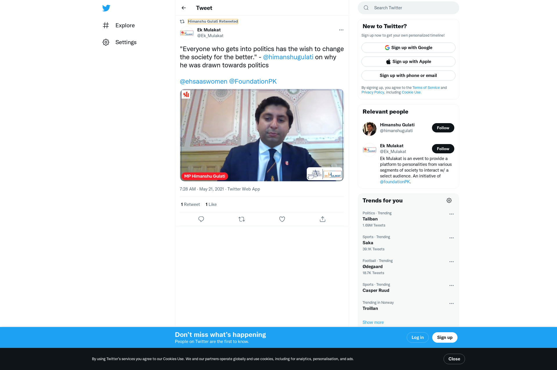 RT @Ek_Mulakat: "Everyone who gets into politics has the wish to change the society for the better." - @himanshugulati on why he was drawn towards politics @ehsaaswomen @FoundationPK https://t.co/ovQvKTeCOn