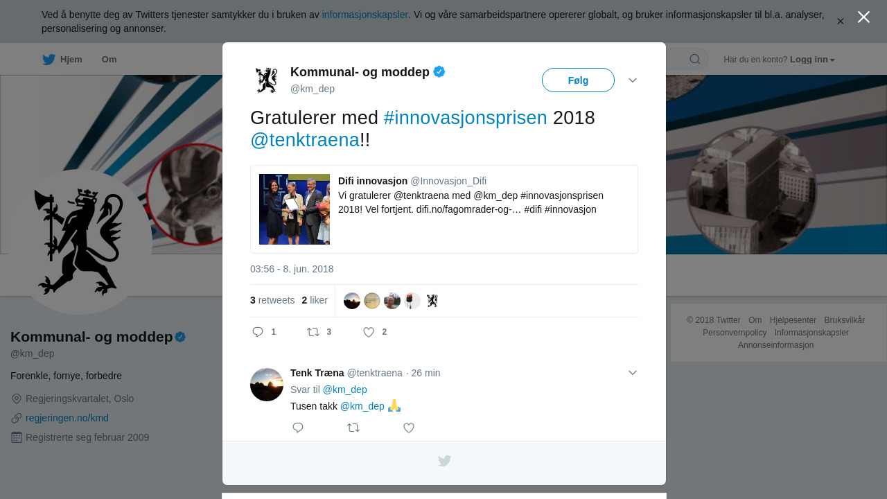 “Vi gratulerer @tenktraena med @km_dep #innovasjonsprisen 2018! Vel fortjent. https://t.co/TfE9VCEdo5 #difi #innovasjon”