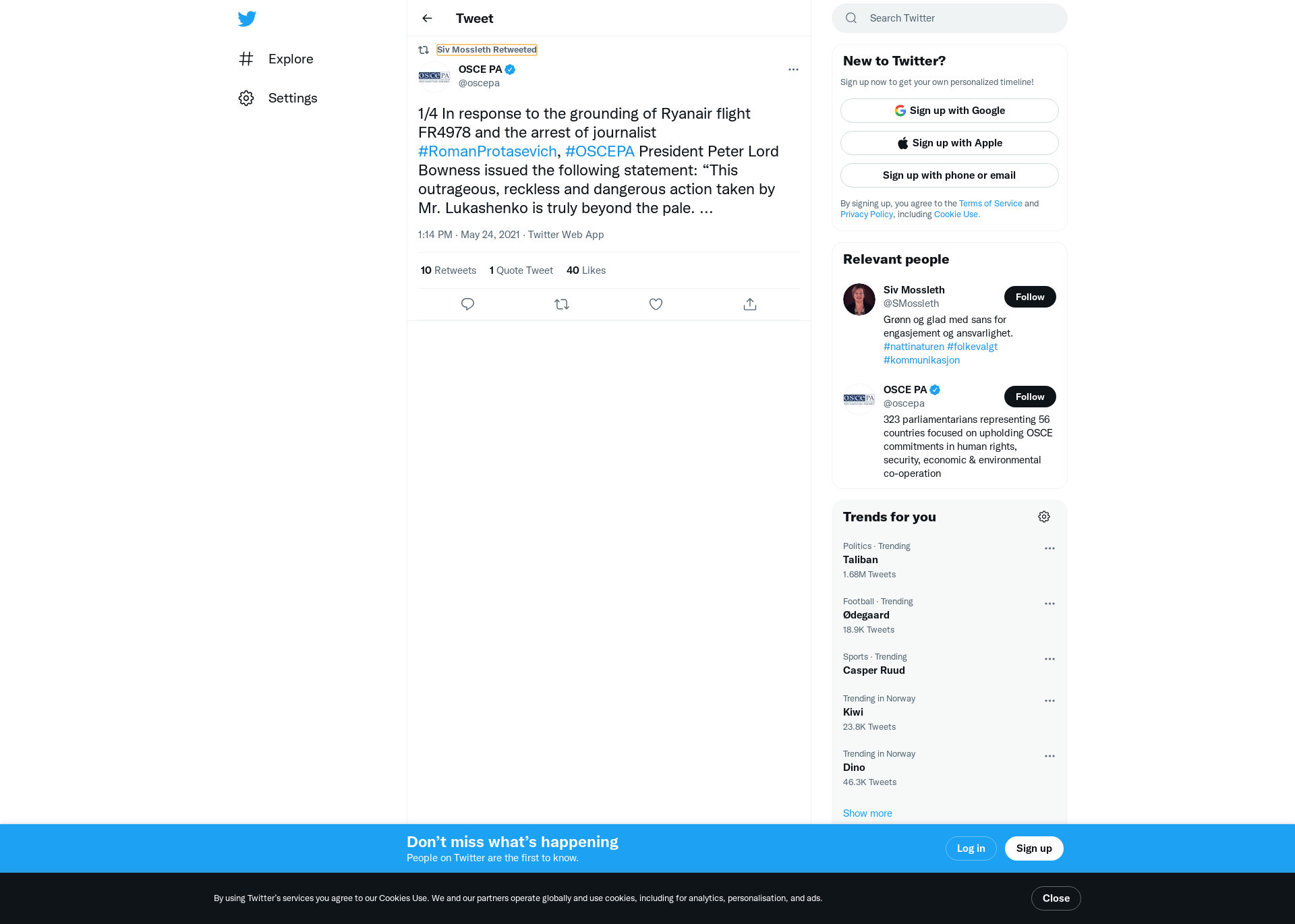 RT @oscepa: 1/4 In response to the grounding of Ryanair flight FR4978 and the arrest of journalist #RomanProtasevich, #OSCEPA President Peter Lord Bowness issued the following statement: “This outrageous, reckless and dangerous action taken by Mr. Lukashenko is truly beyond the pale. ...