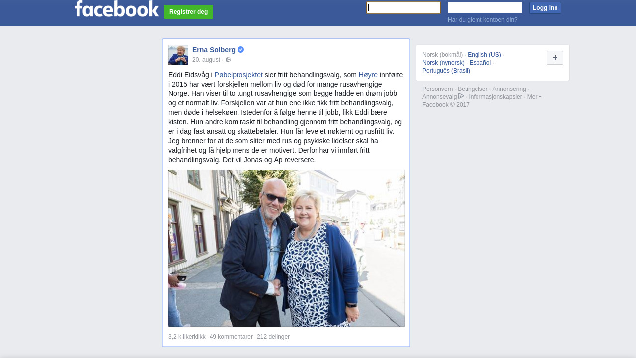 Eddi Eidsvåg i Pøbelprosjektet sier fritt behandlingsvalg, som Høyre innførte i 2015 har vært forskjellen mellom liv og død for mange rusavhengige Norge. Han viser til to tungt rusavhengige som begge hadde en drøm jobb og et normalt liv. Forskjellen var at hun ene ikke fikk fritt behandlingsvalg, men døde i helsekøen. Istedenfor å følge henne til jobb, fikk Eddi bære kisten. Hun andre kom raskt til behandling gjennom fritt behandlingsvalg, og er i dag fast ansatt og skattebetaler. Hun får leve et nøkternt og rusfritt liv. Jeg brenner for at de som sliter med rus og psykiske lidelser skal ha valgfrihet og få hjelp mens de er motivert. Derfor har vi innført fritt behandlingsvalg. Det vil Jonas og Ap reversere.