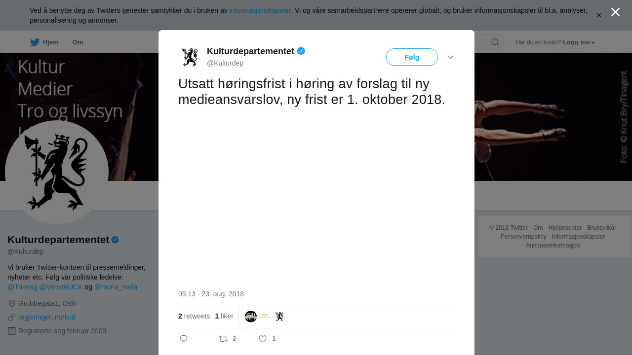Kulturdepartementet sendte 9. mai 2018 et forslag til ny medieansvarslov på alminnelig høring. Høringsfristen ble satt til 10. september 2018. Etter dette har en rekke høringsinstanser på anmodning fått utsatt frist til 24. september. Av hensyn til lik...