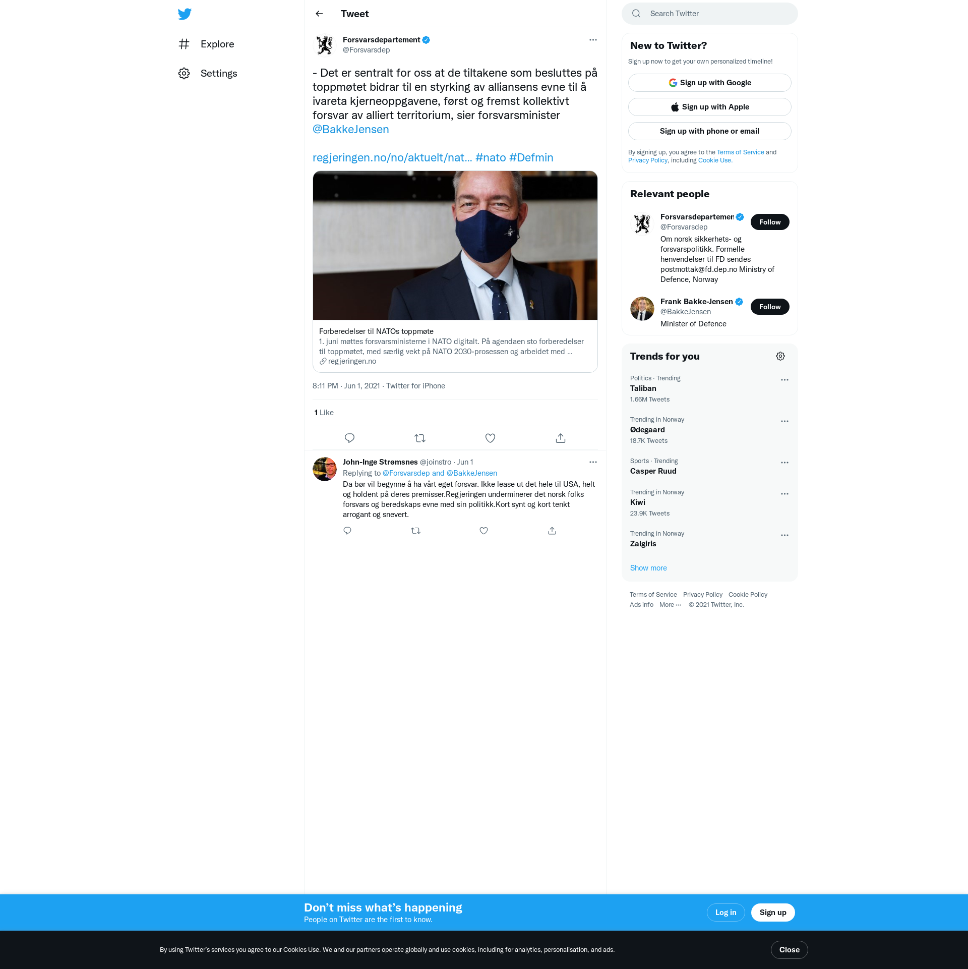1. juni møttes forsvarsministerne i NATO digitalt. På agendaen sto forberedelser til toppmøtet, med særlig vekt på NATO 2030-prosessen og arbeidet med avskrekking og forsvar. I tillegg ble NATOs internasjonale operasjoner i Afghanistan og Irak tatt opp.