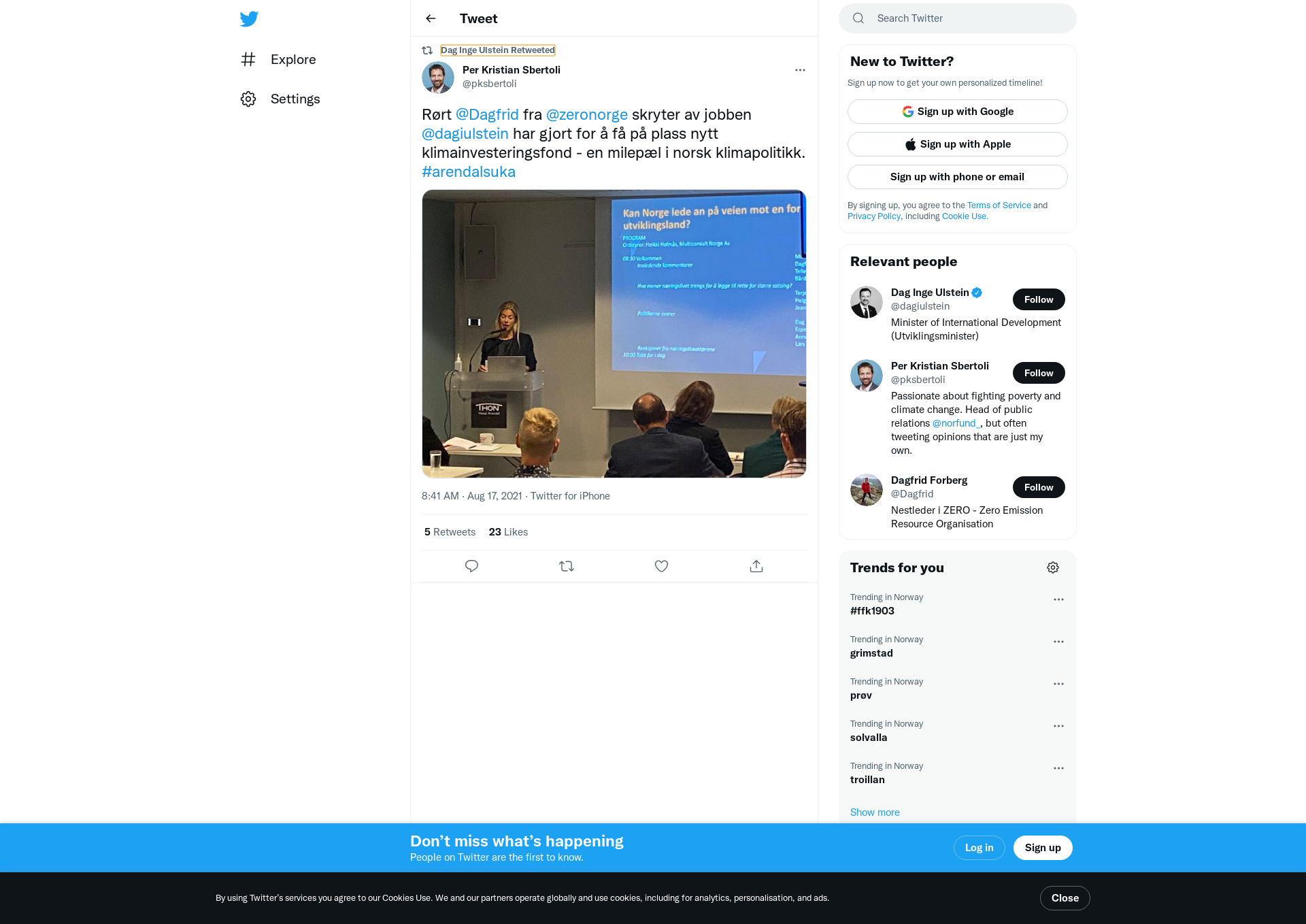 RT @pksbertoli: Rørt @Dagfrid fra @zeronorge skryter av jobben @dagiulstein har gjort for å få på plass nytt klimainvesteringsfond - en milepæl i norsk klimapolitikk.