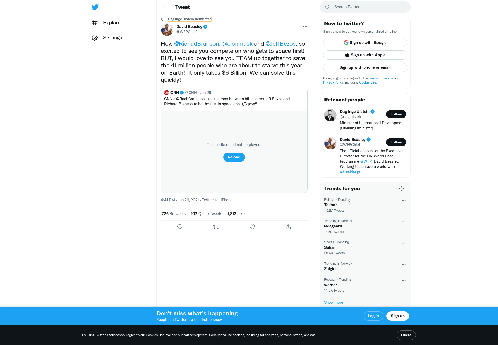 RT @WFPChief: Hey, @RichadBranson, @elonmusk and @JeffBezos, so excited to see you compete on who gets to space first! BUT, I would love to see you TEAM up together to save the 41 million people who are about to starve this year on Earth! It only takes $6 Billion. We can solve this quickly!