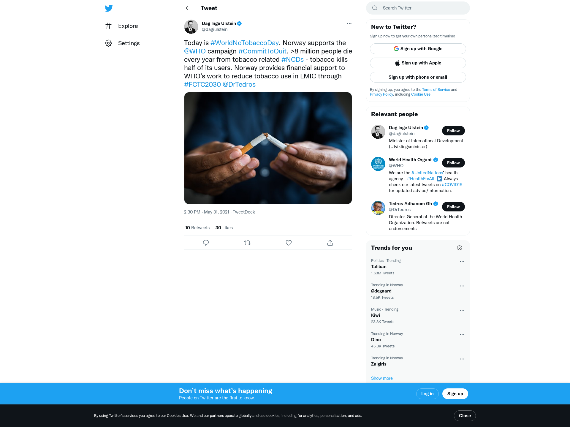 Today is #WorldNoTobaccoDay. Norway supports the @WHO campaign #CommitToQuit. >8 million people die every year from tobacco related #NCDs - tobacco kills half of its users. Norway provides financial support to WHO’s work to reduce tobacco use in LMIC through #FCTC2030 @DrTedros https://t.co/kKHrZpryec
