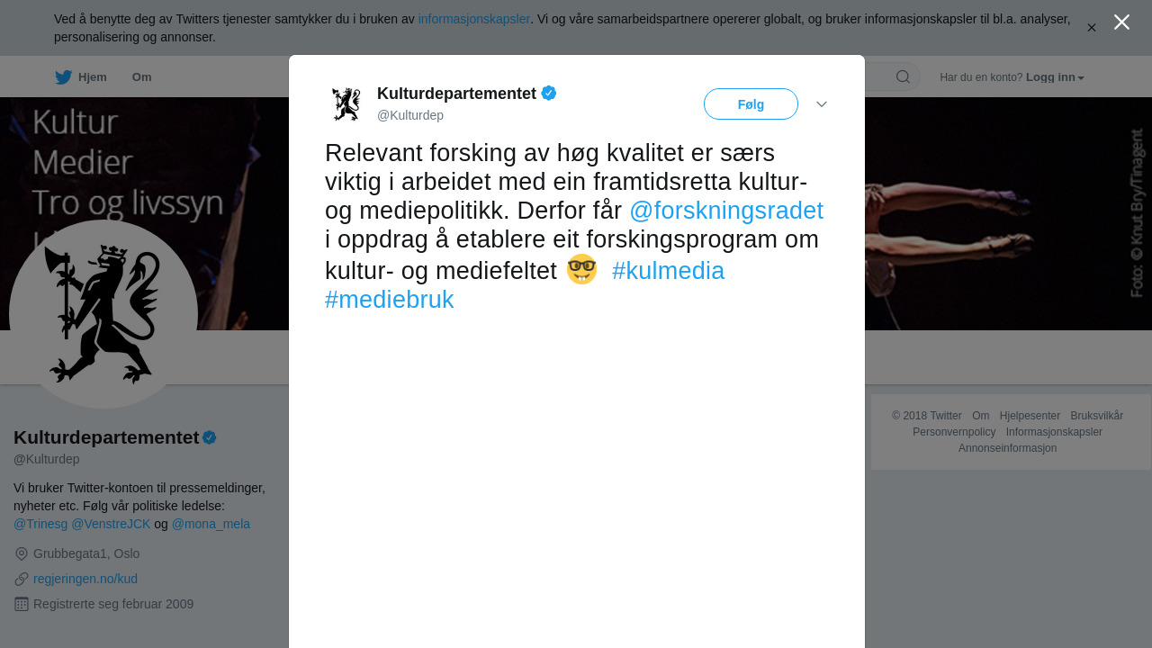 Kulturdepartementet gir Noregs forskingsråd i oppdrag å etablere eit forskingsprogram om kulturfeltet og mediefeltet med oppstart i 2019. Departementet legg opp til ei årleg løyving på om lag 16 millionar kroner over fem år.