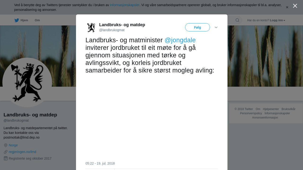 Landbruks- og matminister Jon Georg Dale inviterer Norges Bondelag og Norsk Bonde- og Småbrukarlag til eit møte måndag 23. juli for å gå gjennom situasjonen med tørke og avlingssvikt, og korleis jordbruket samarbeider for å sikre størst mogleg avling.