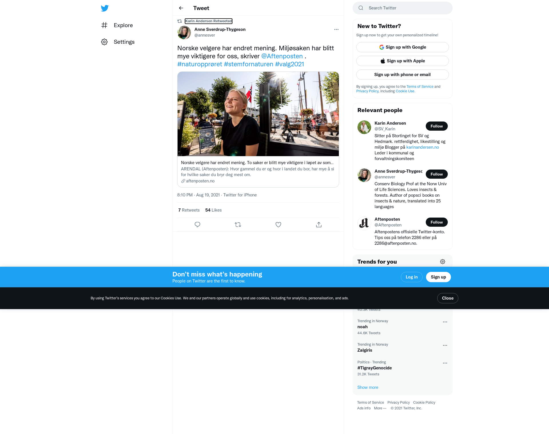 RT @annesver: Norske velgere har endret mening. Miljøsaken har blitt mye viktigere for oss, skriver @Aftenposten . #naturopprøret #stemfornaturen #valg2021 https://t.co/6QYDhQlxwV