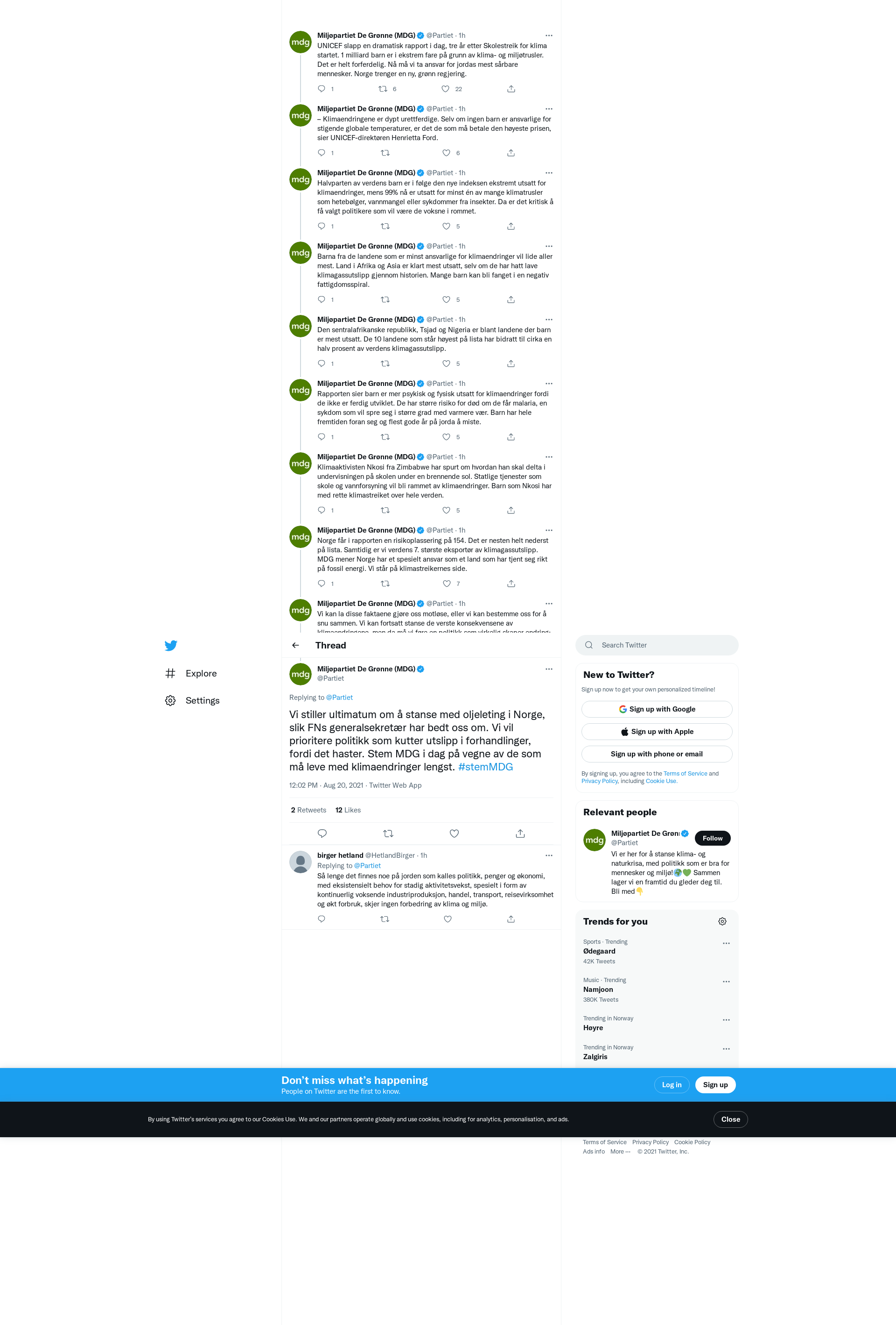 Vi stiller ultimatum om å stanse med oljeleting i Norge, slik FNs generalsekretær har bedt oss om. Vi vil prioritere politikk som kutter utslipp i forhandlinger, fordi det haster. Stem MDG i dag på vegne av de som må leve med klimaendringer lengst. #stemMDG