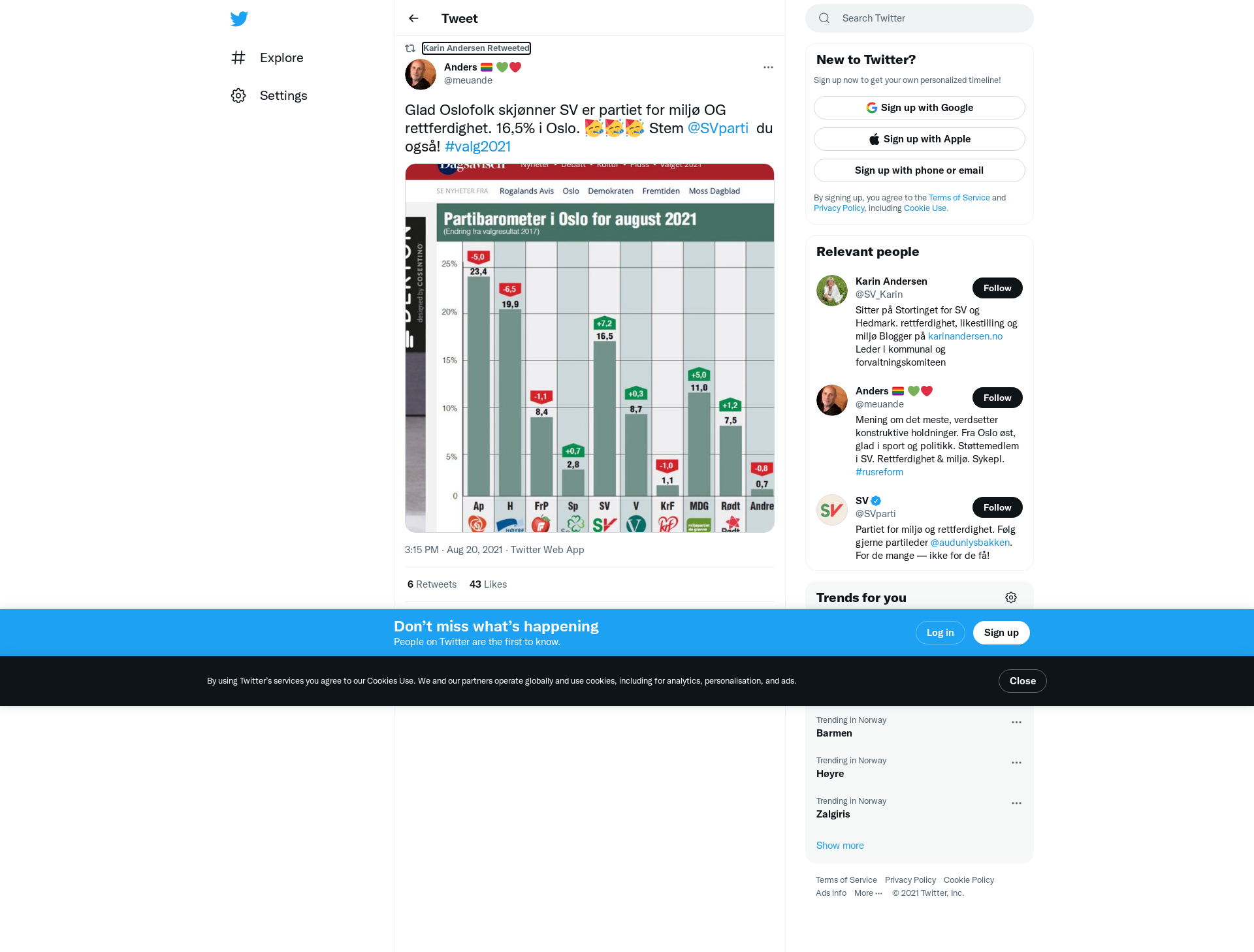 RT @meuande: Glad Oslofolk skjønner SV er partiet for miljø OG rettferdighet. 16,5% i Oslo. 🥳🥳🥳 Stem @SVparti du også! #valg2021 https://t.co/LJsK9emFjU