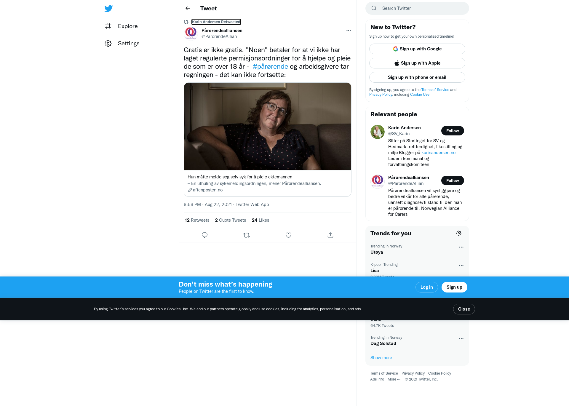 RT @ParorendeAllian: Gratis er ikke gratis. "Noen" betaler for at vi ikke har laget regulerte permisjonsordninger for å hjelpe og pleie de som er over 18 år - #pårørende og arbeidsgivere tar regningen - det kan ikke fortsette: https://t.co/CqugobuZBX