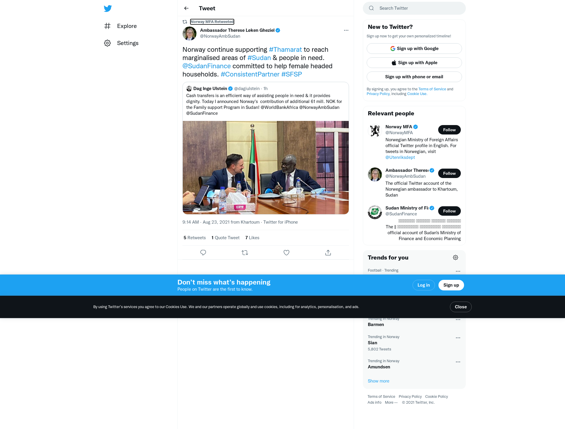 RT @NorwayAmbSudan: Norway continue supporting #Thamarat to reach marginalised areas of #Sudan & people in need. @SudanFinance committed to help female headed households. #ConsistentPartner #SFSP