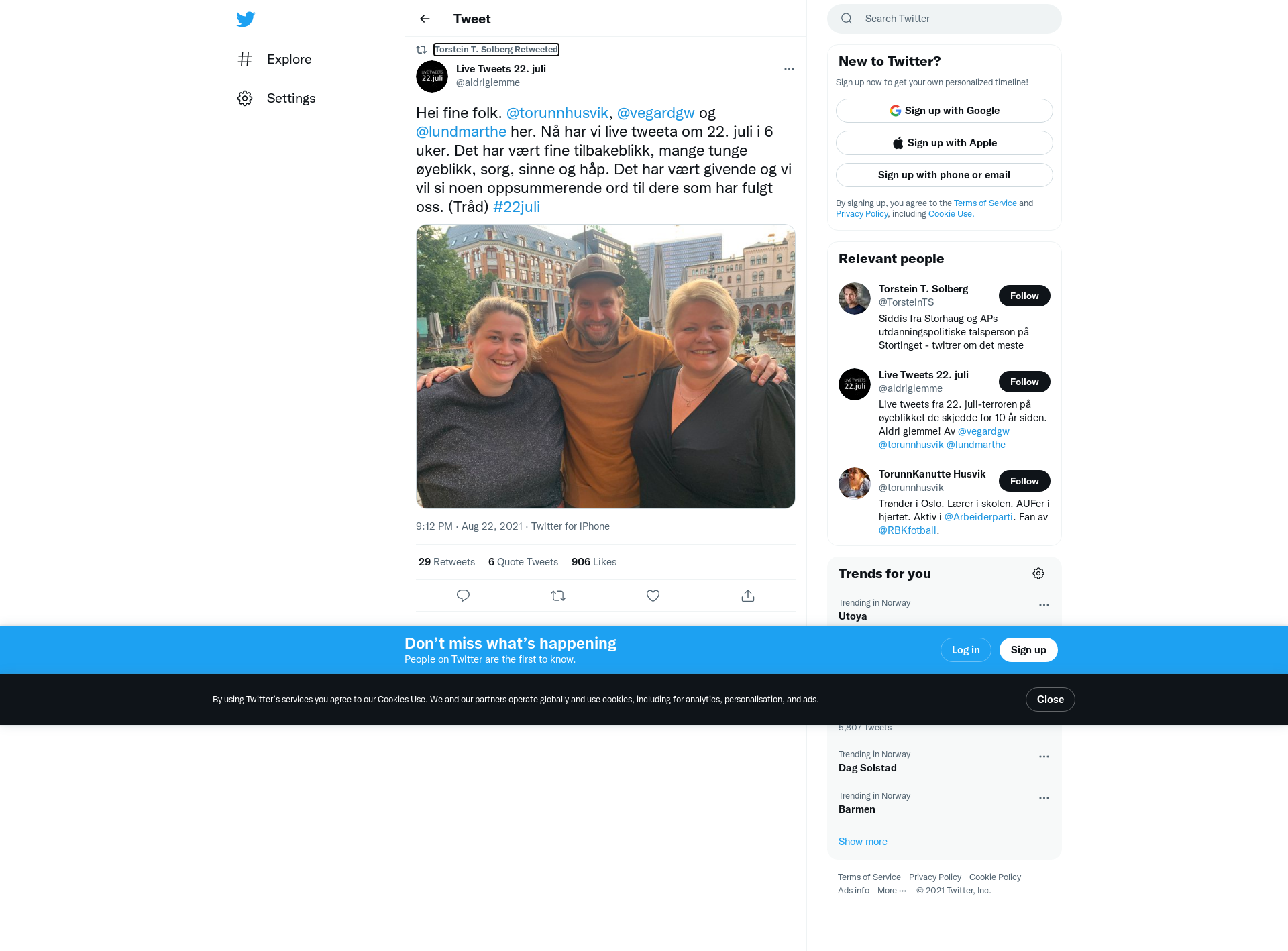 RT @aldriglemme: Hei fine folk. @torunnhusvik, @vegardgw og @lundmarthe her. Nå har vi live tweeta om 22. juli i 6 uker. Det har vært fine tilbakeblikk, mange tunge øyeblikk, sorg, sinne og håp. Det har vært givende og vi vil si noen oppsummerende ord til dere som har fulgt oss. (Tråd) #22juli https://t.co/fS3x1vMpS3