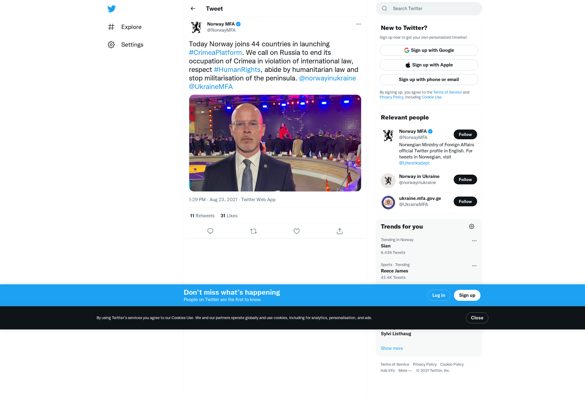Today Norway joins 44 countries in launching #CrimeaPlatform. We call on Russia to end its occupation of Crimea in violation of international law, respect #HumanRights, abide by humanitarian law and stop militarisation of the peninsula. @norwayinukraine @UkraineMFA https://t.co/ff8ygV0o1J