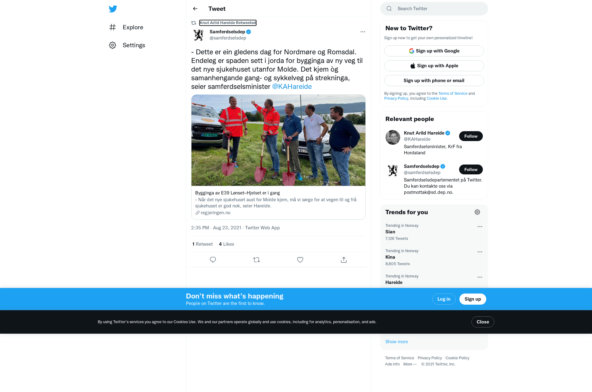 RT @samferdselsdep: - Dette er ein gledens dag for Nordmøre og Romsdal. Endeleg er spaden sett i jorda for bygginga av ny veg til det nye sjukehuset utanfor Molde. Det kjem òg samanhengande gang- og sykkelveg på strekninga, seier samferdselsminister @KAHareide https://t.co/PgRsl28vW7