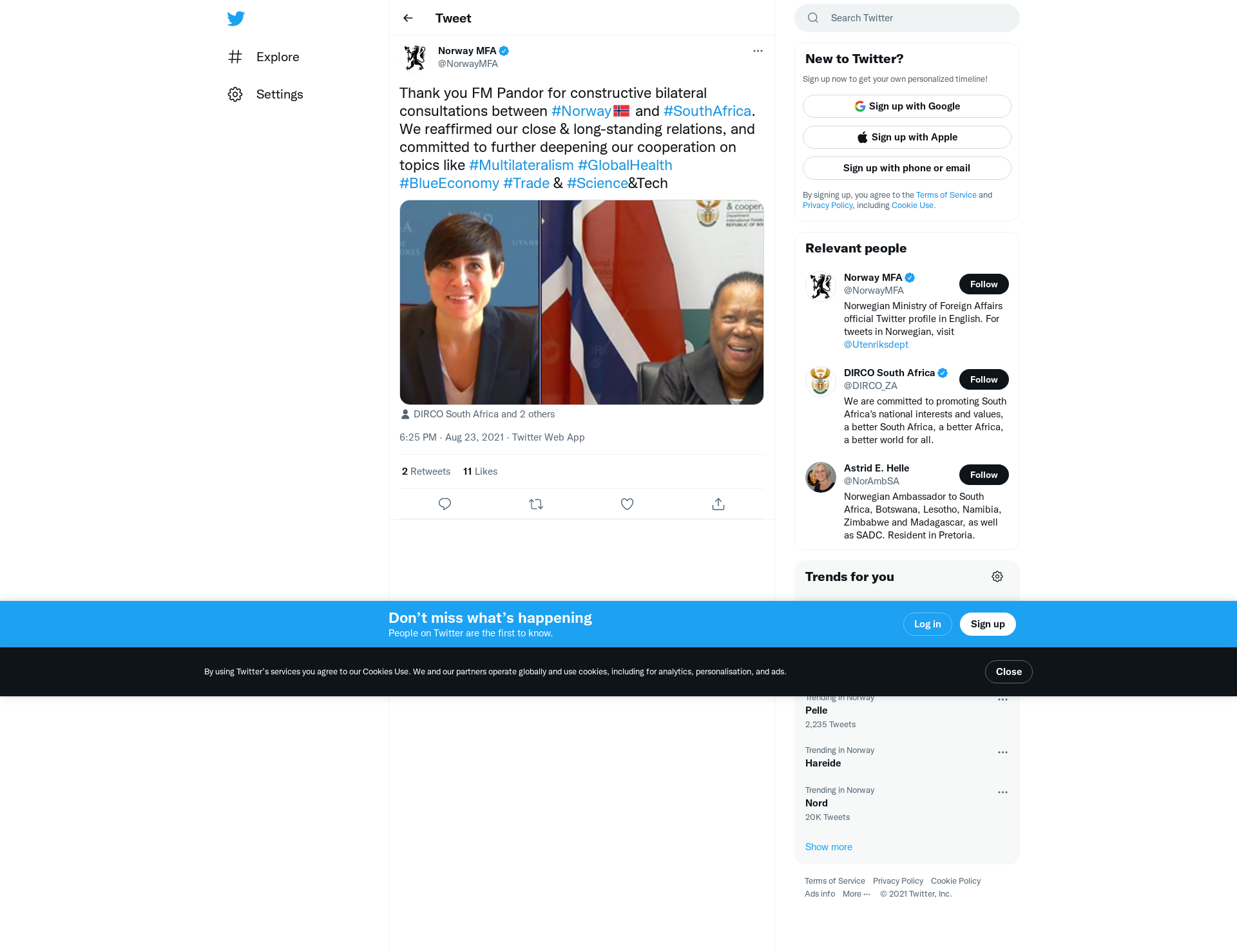 Thank you FM Pandor for constructive bilateral consultations between #Norway and #SouthAfrica. We reaffirmed our close & long-standing relations, and committed to further deepening our cooperation on topics like #Multilateralism #GlobalHealth #BlueEconomy #Trade & #Science&Tech https://t.co/aWJMhRdAA1