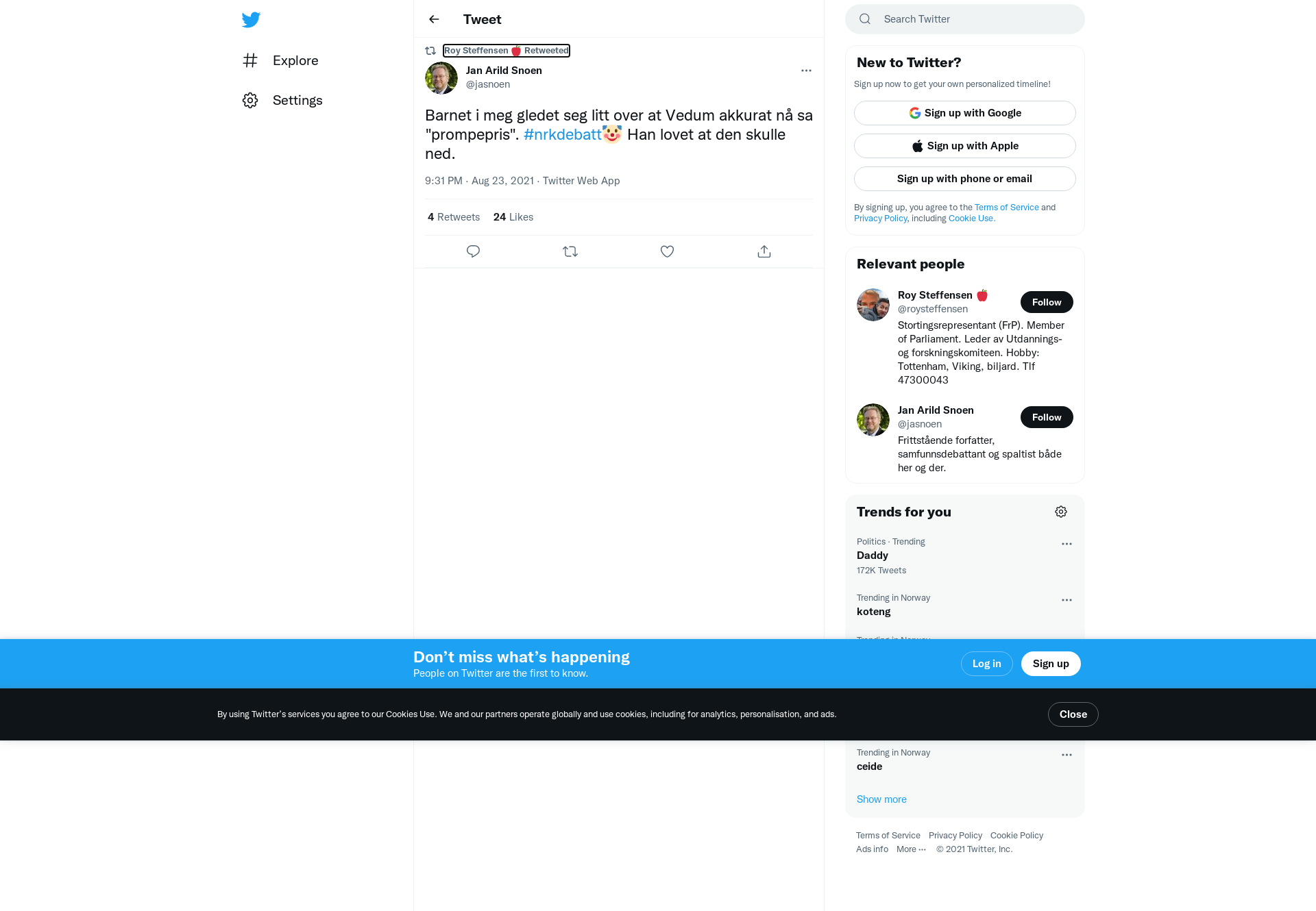 RT @jasnoen: Barnet i meg gledet seg litt over at Vedum akkurat nå sa "prompepris". #nrkdebatt🤡 Han lovet at den skulle ned.