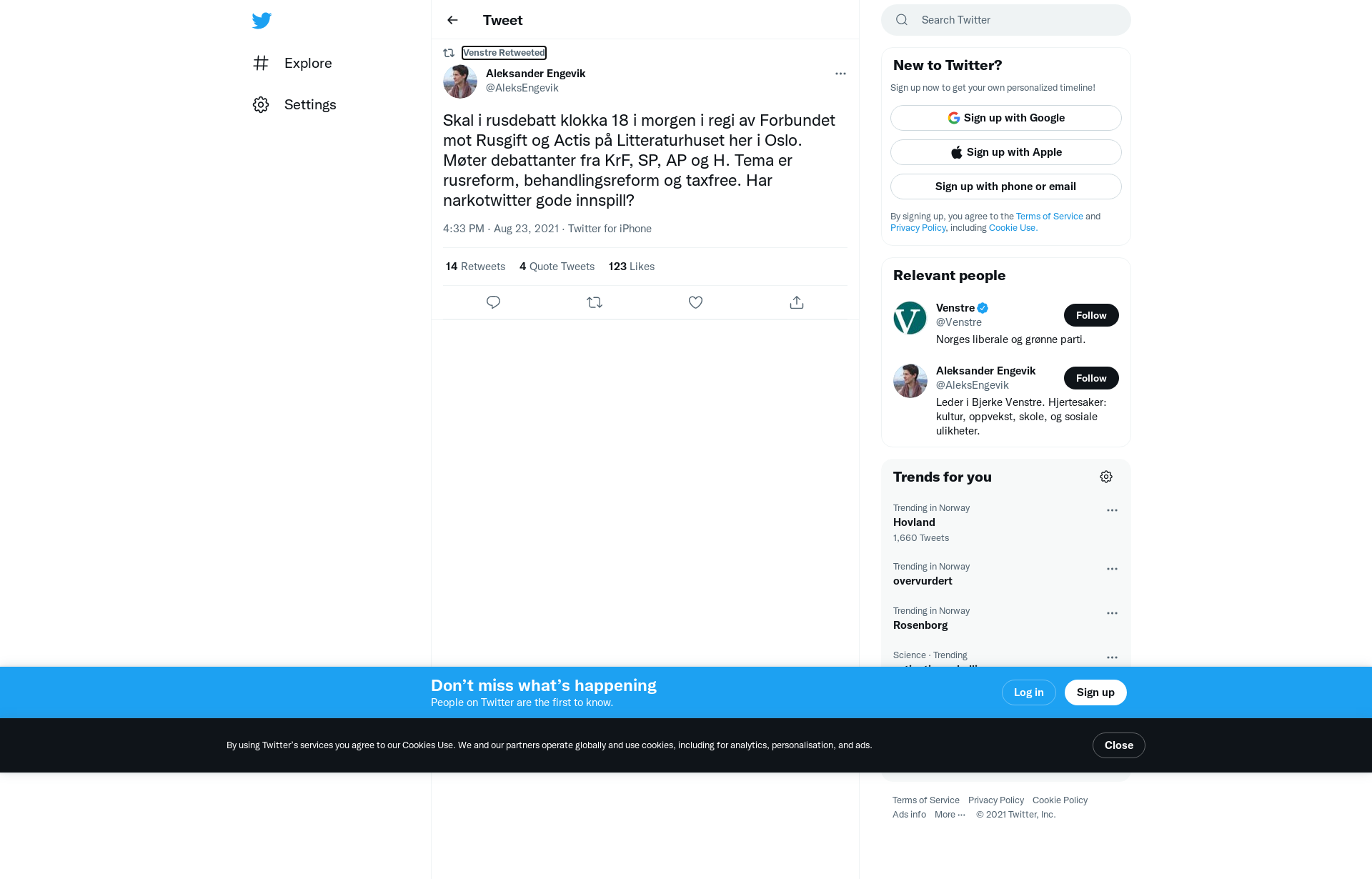 RT @AleksEngevik: Skal i rusdebatt klokka 18 i morgen i regi av Forbundet mot Rusgift og Actis på Litteraturhuset her i Oslo. Møter debattanter fra KrF, SP, AP og H. Tema er rusreform, behandlingsreform og taxfree. Har narkotwitter gode innspill?