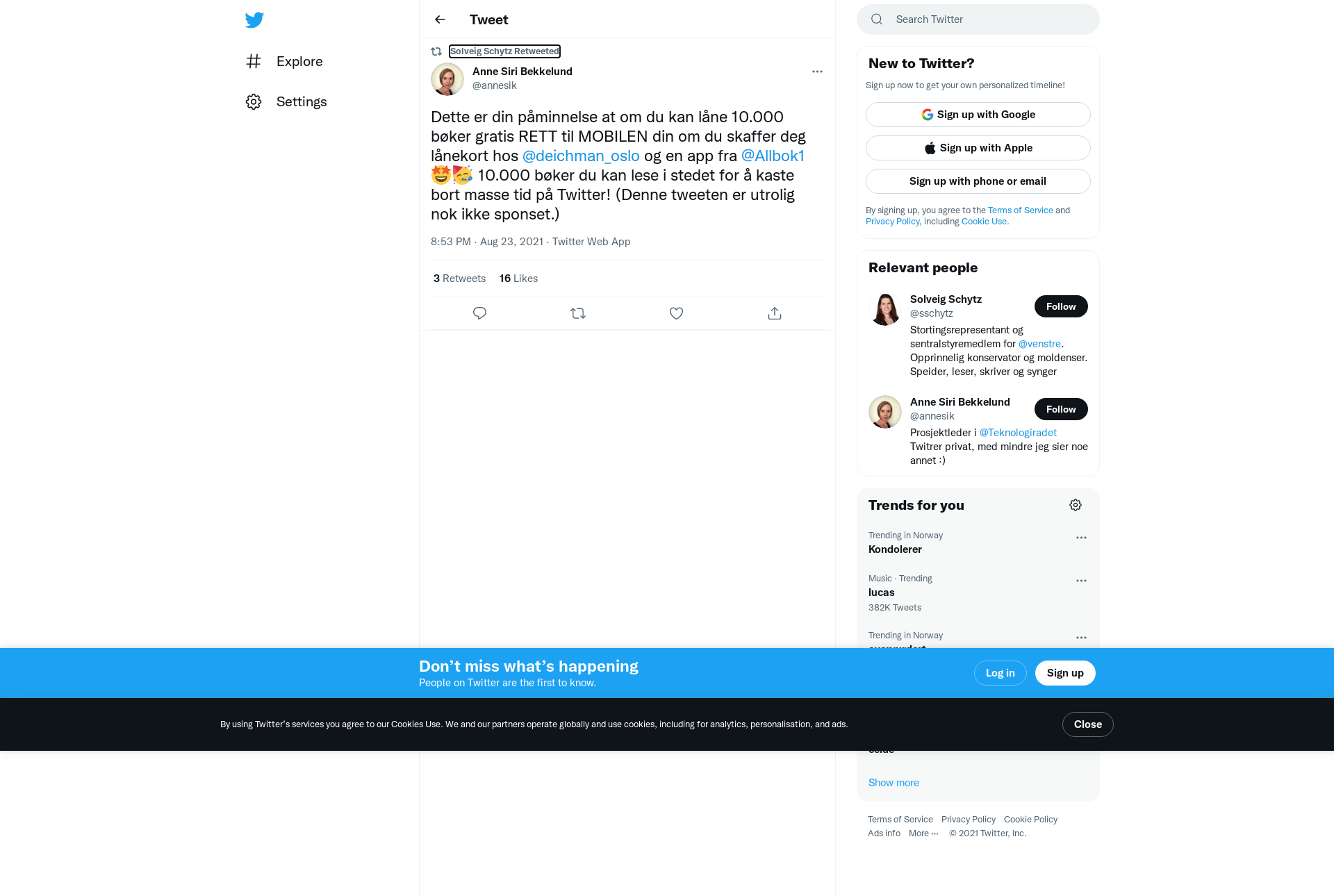 RT @annesik: Dette er din påminnelse at om du kan låne 10.000 bøker gratis RETT til MOBILEN din om du skaffer deg lånekort hos @deichman_oslo og en app fra @Allbok1 🤩🥳 10.000 bøker du kan lese i stedet for å kaste bort masse tid på Twitter! (Denne tweeten er utrolig nok ikke sponset.)