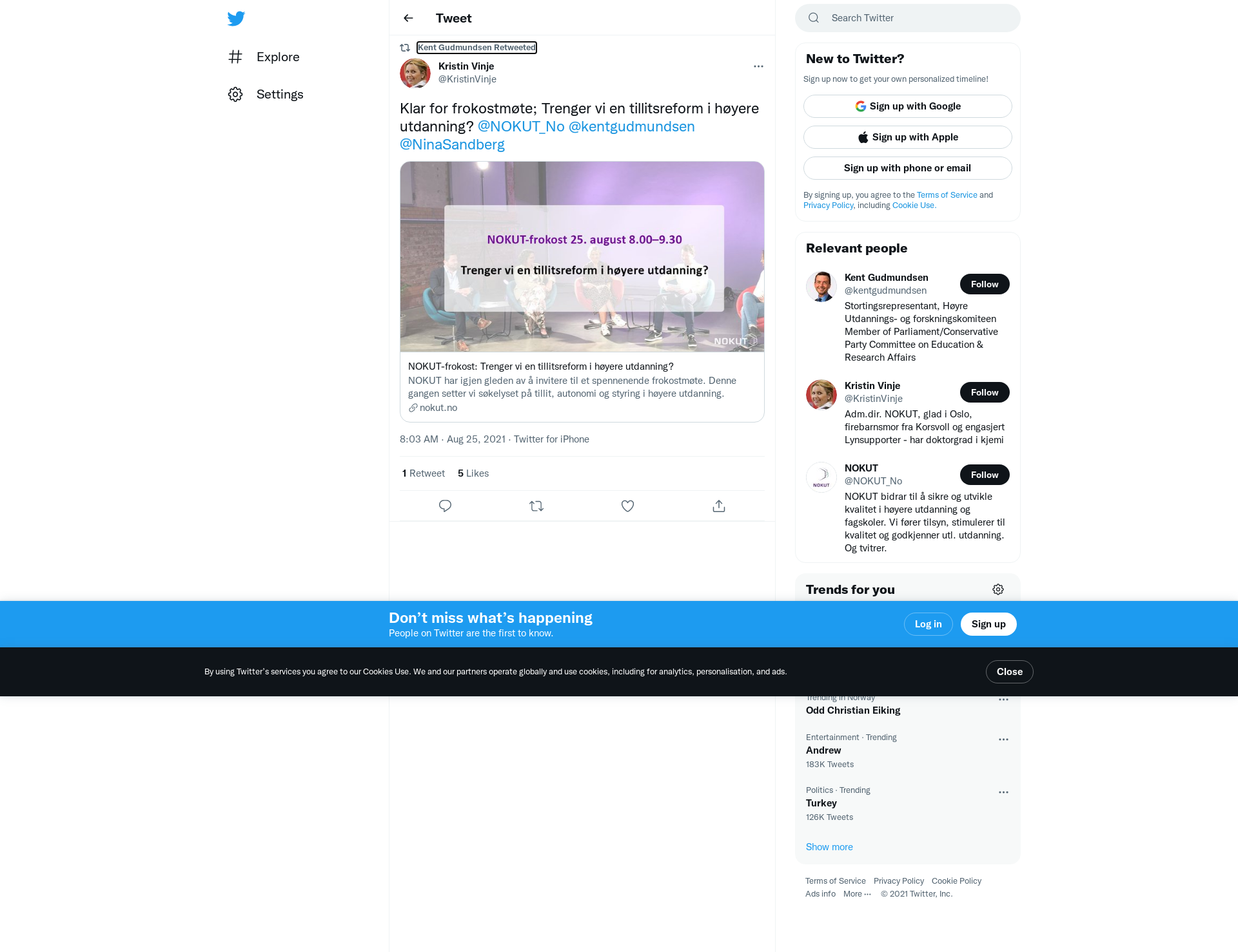 RT @KristinVinje: Klar for frokostmøte; Trenger vi en tillitsreform i høyere utdanning? @NOKUT_No @kentgudmundsen @NinaSandberg https://t.co/ET4UsbRSOx